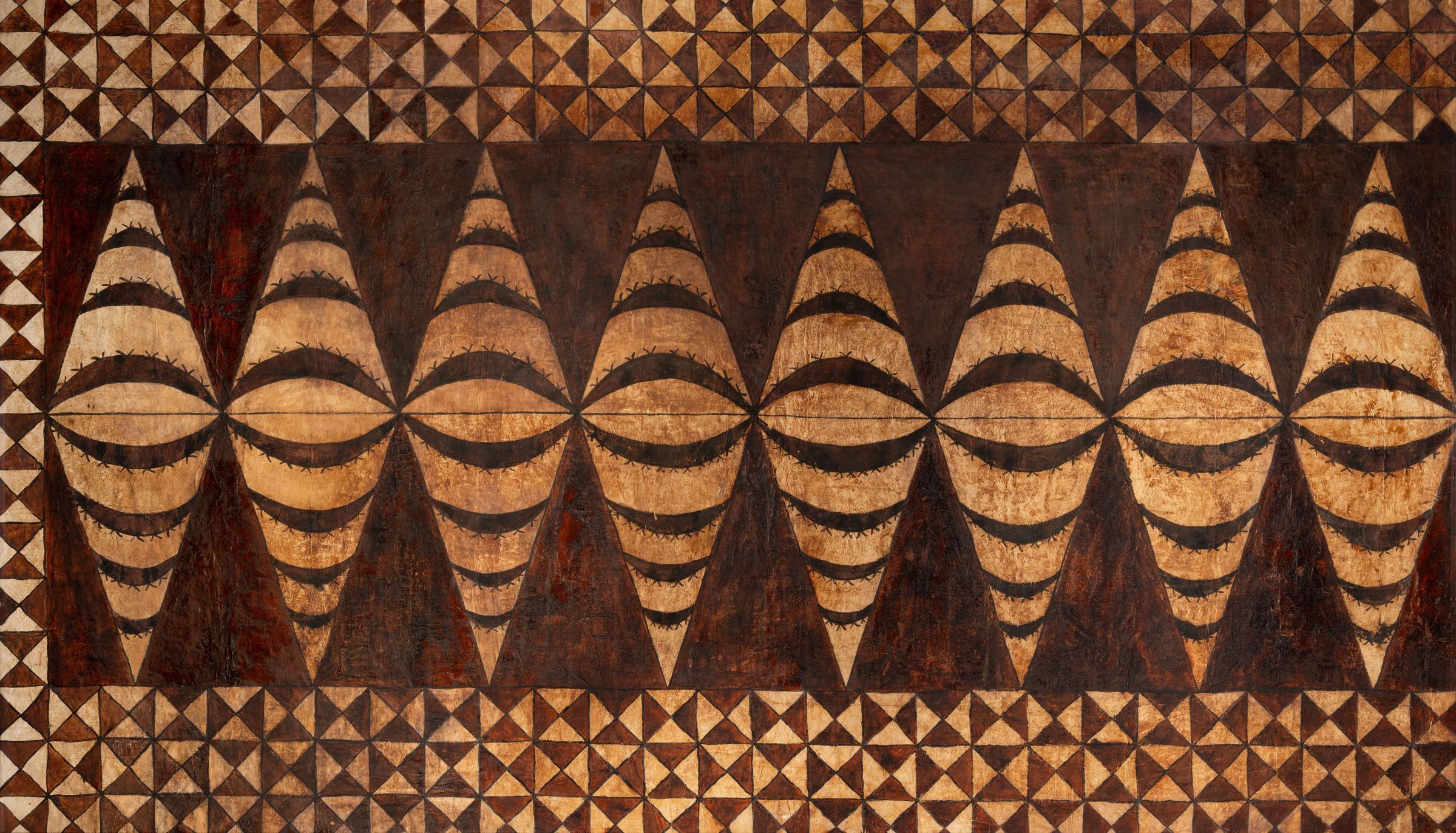This Fijian Masi, painted in black and brown pigments with a row of diamonds flanked by intricately tiled borders, is part of the Hotel’s distinct collection of diverse and stunning bark cloth from across the Pacific.