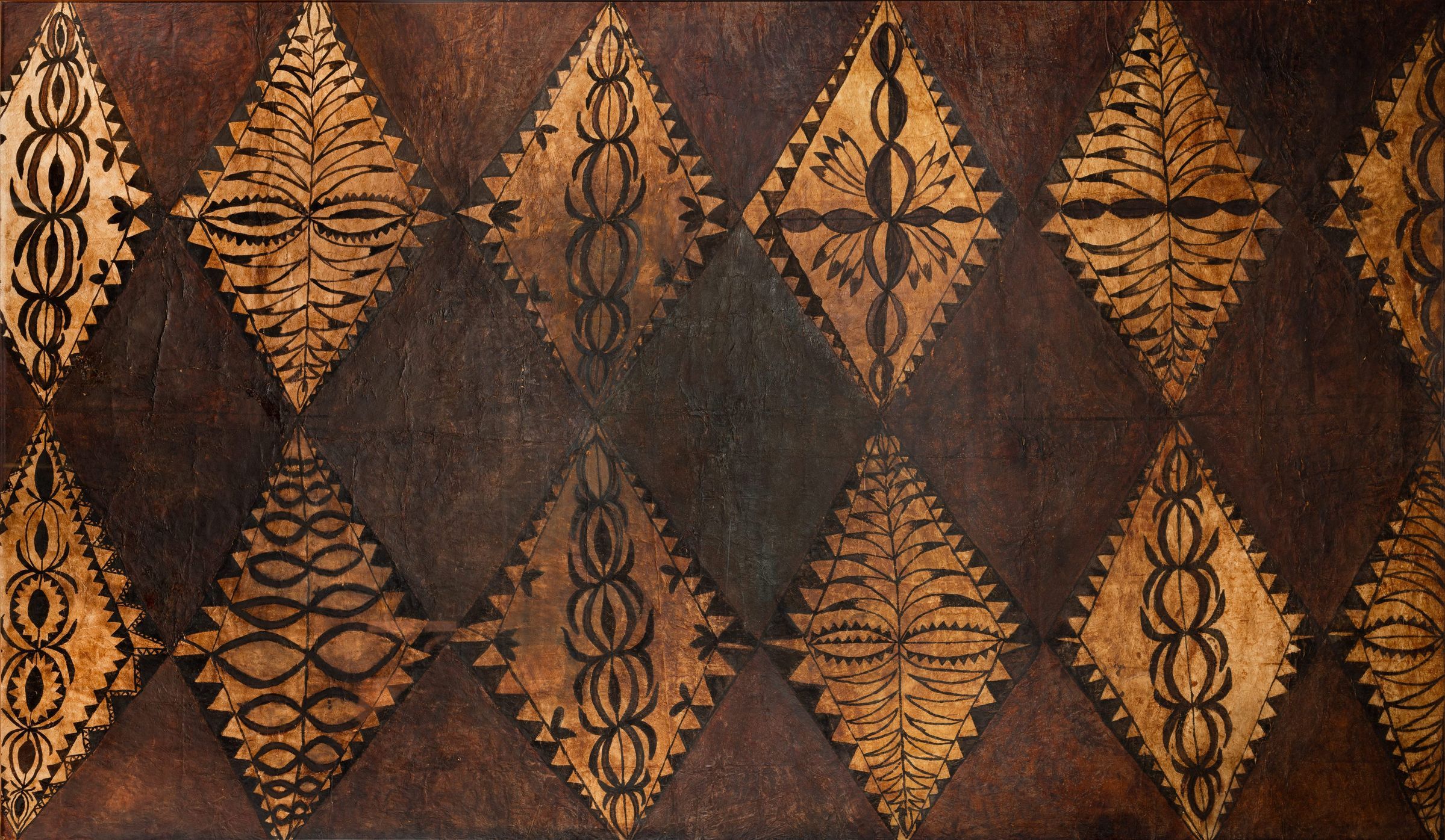 This Fijian masi, painted with two rows of triangular lozenges filled with intricate crescent designs in black and reddish-brown pigments, is part of the Hotel’s distinct collection of diverse and stunning bark cloth from across the Pacific.