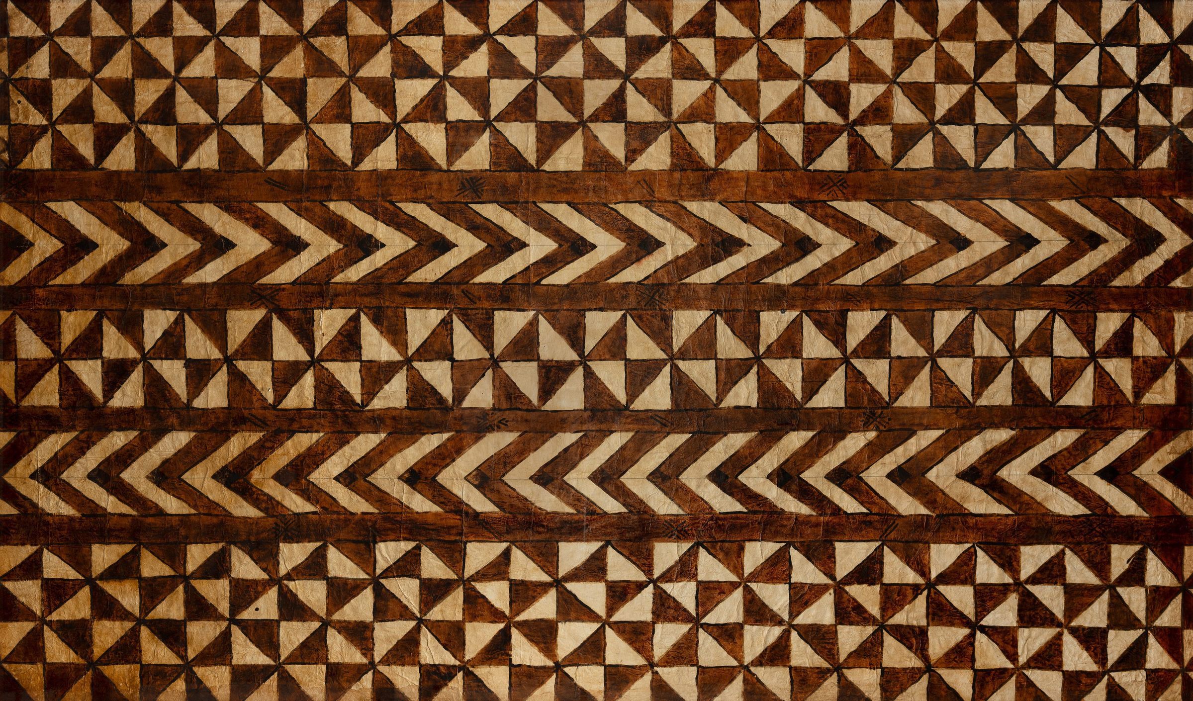 This Tongan ngatu, painted in brown dye with alternating vertical bands of chevrons and triangle motifs, is part of the Hotel’s distinct collection of diverse and stunning bark cloth from across the Pacific.