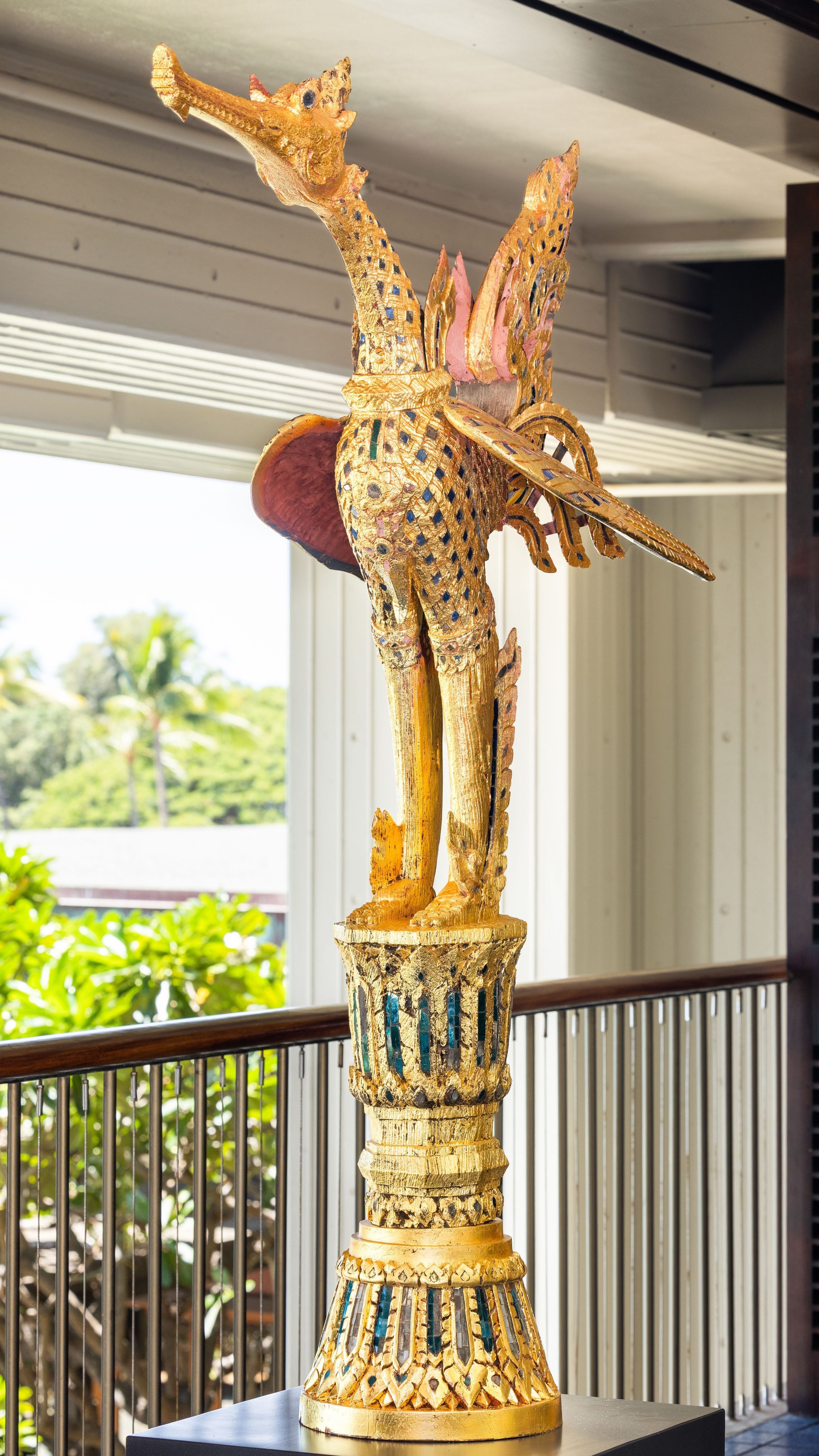 This stylized Thai Hongsa bird from the 20th century stands proudly with wings gracefully outstretched, embellished with intricate inlaid glass detailing. In its prominent place in the Mauna Kea’s lobby, this captivating piece invites viewers to not only behold its beauty, but consider the layers of symbolism woven into its form, offering a glimpse into the spiritual aspirations that transcend time and cultural boundaries.
