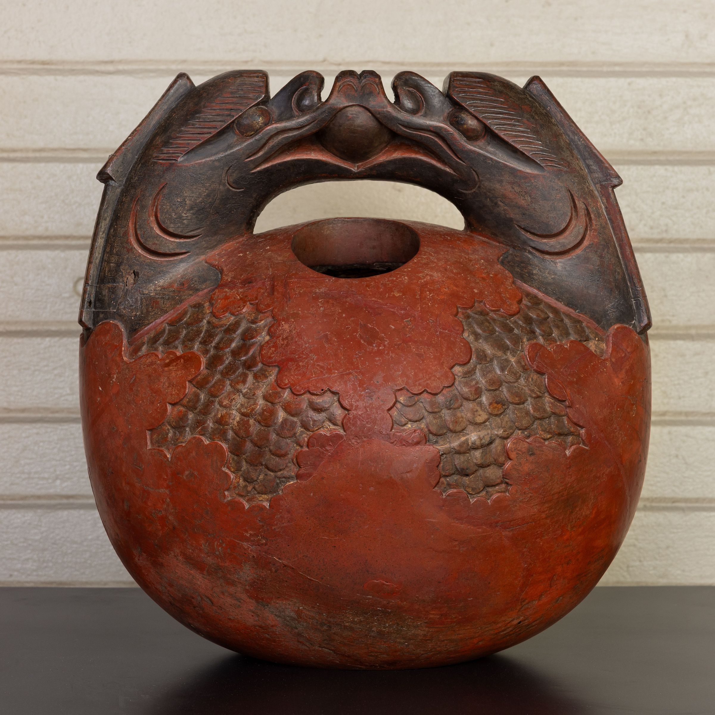 Finished with red and black lacquer, its rounded body is carved in an ornate dragon scale pattern, while the top of the instrument forms the shape of two facing dragon heads holding a ball - the symbol of the universe.