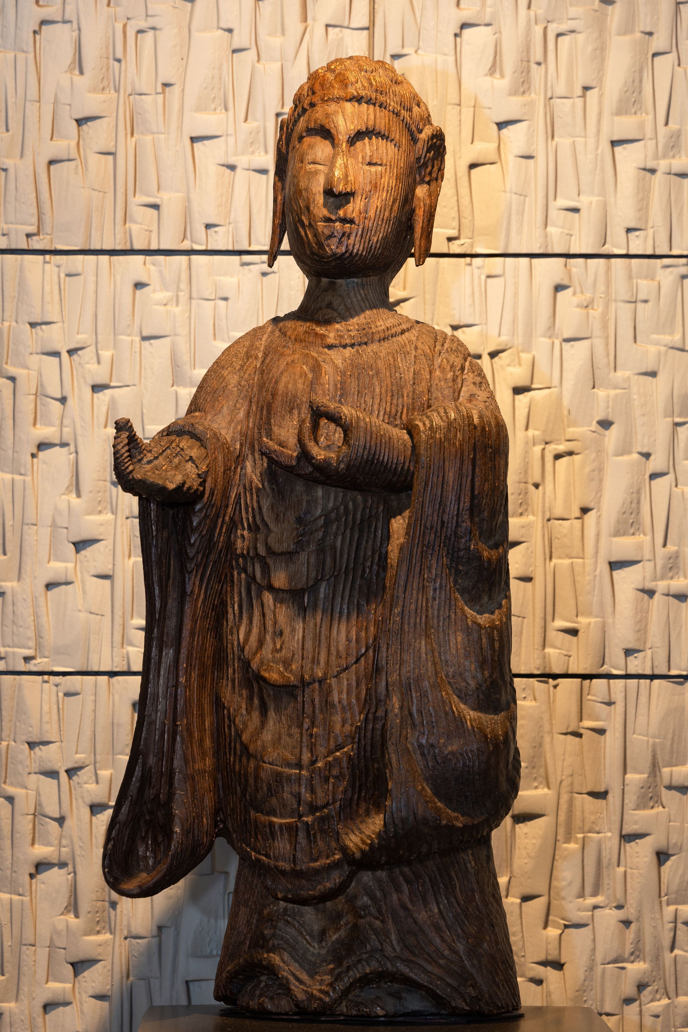 This centuries-old figure showcases the artistry of its era, employing the dan-zo carving technique that accentuates the wood's natural grain, creating a mesmerizing, rhythmic effect across its surface. The sculpture not only captures the essence of Zen meditation's sublimity, but also reflects the loosening of social strictures and the creative power unleashed by Zen Buddhism during the Kamakura period.