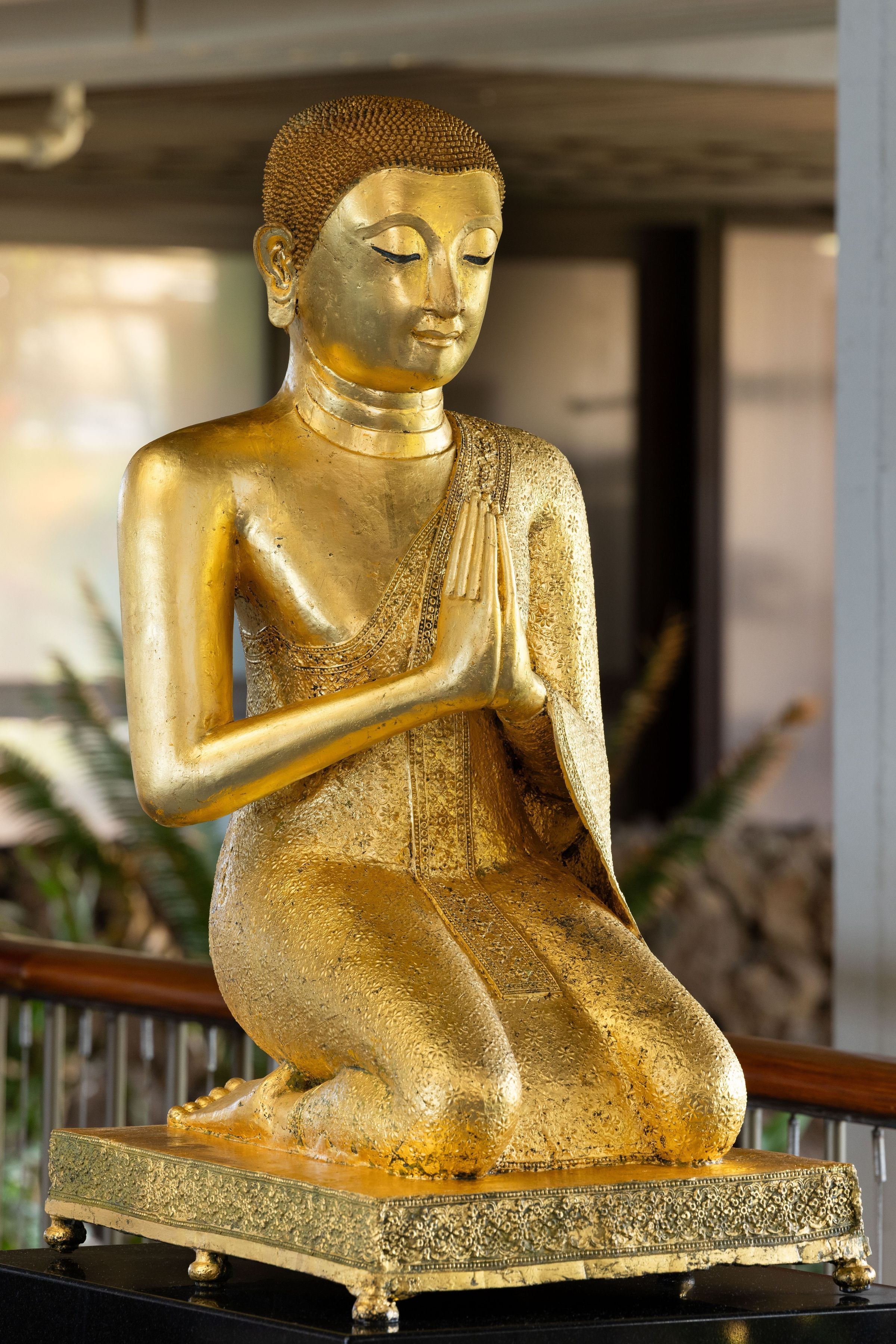 Once, in a Thai Buddhist temple, pairs of such kneeling acolytes might have knelt at the foot of a central Buddha image. Now, positioned on either side of the Mauna Kea's entryway, these figures welcome guests to the hotel, and invite viewers to connect with their enduring reverence and serenity.