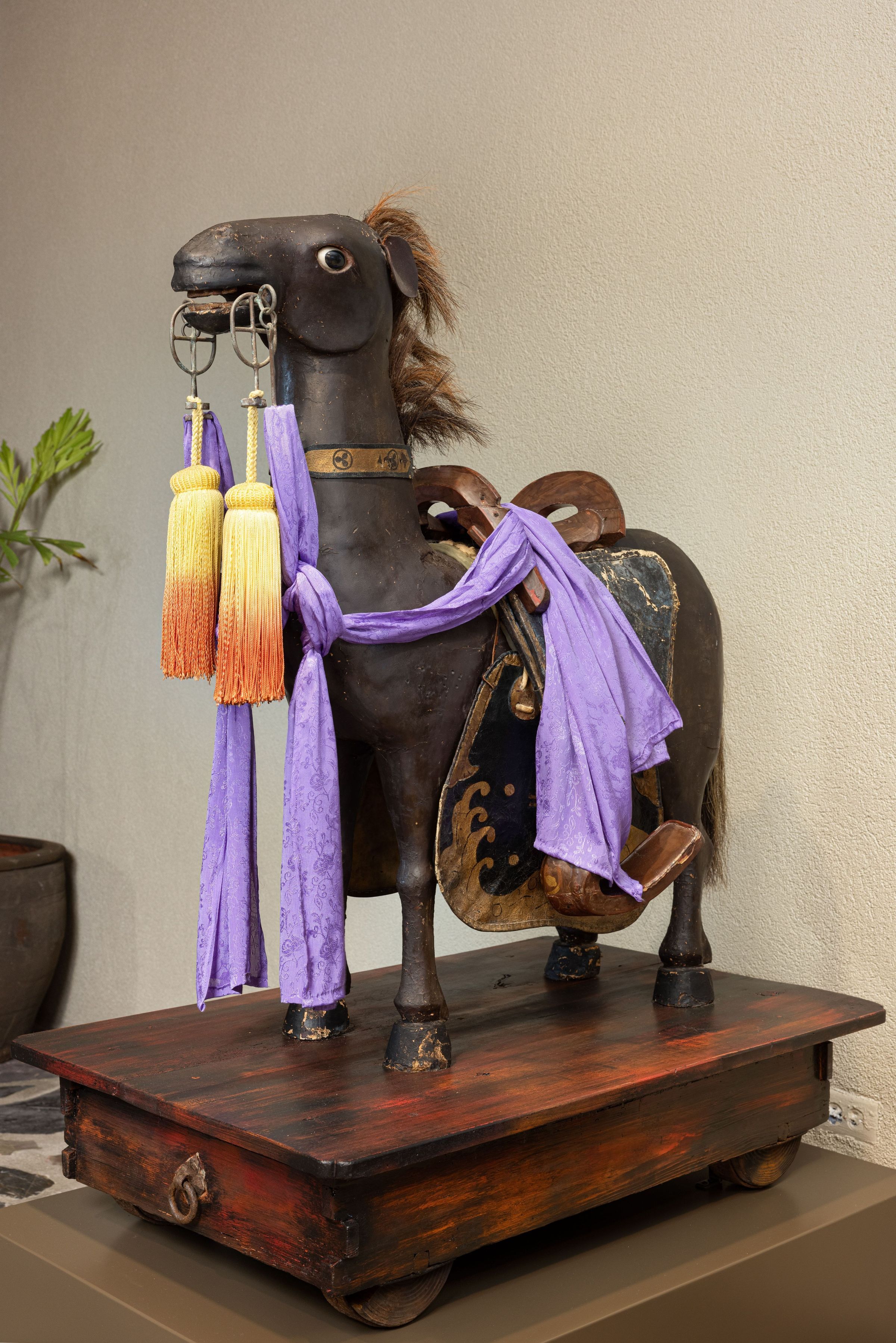 This wooden equine features leather ears and a horse hair mane, and stands on a wheeled rectangular base, showcasing traditional Japanese lacquer saddle, stirrups, and iron ring pulls on its sides.