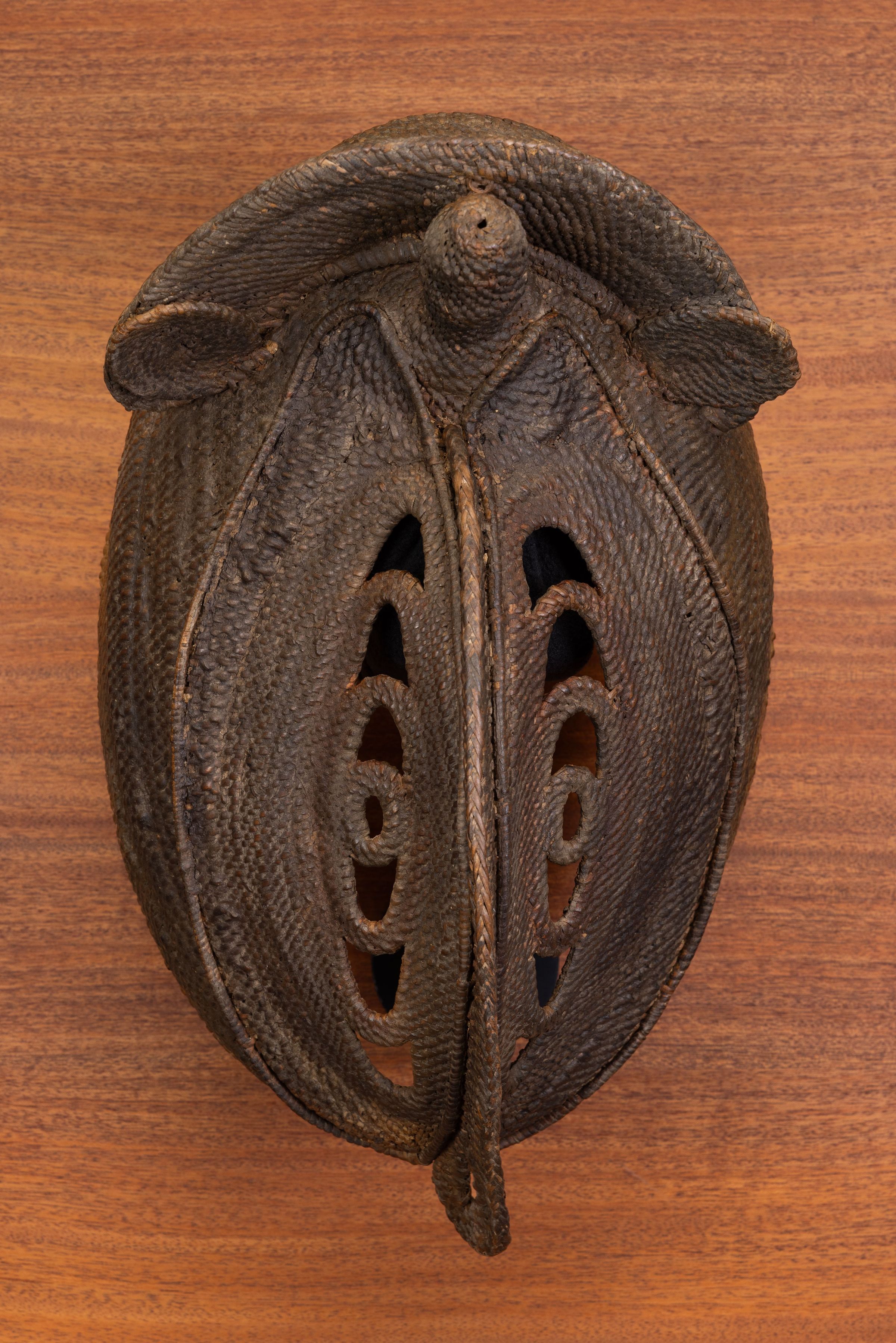 Painted basketry baba (spirit) masks, intricately crafted by skilled Abelam artisans in New Guinea's Maprik region, play a significant role in adolescent initiation rites. For the Abelam, these ceremonies mark a young boy’s entry into manhood, with the initiate donning a ceremonial mask as he undergoes a symbolic transformation. Part of the process involves ritual bloodletting, intended to remove the “female blood” inherited from his mother and to prepare him for adulthood. Wearing this plaited rattan mask, the initiate impersonates the spirits of female ancestors, embodying the essence of his heritage.