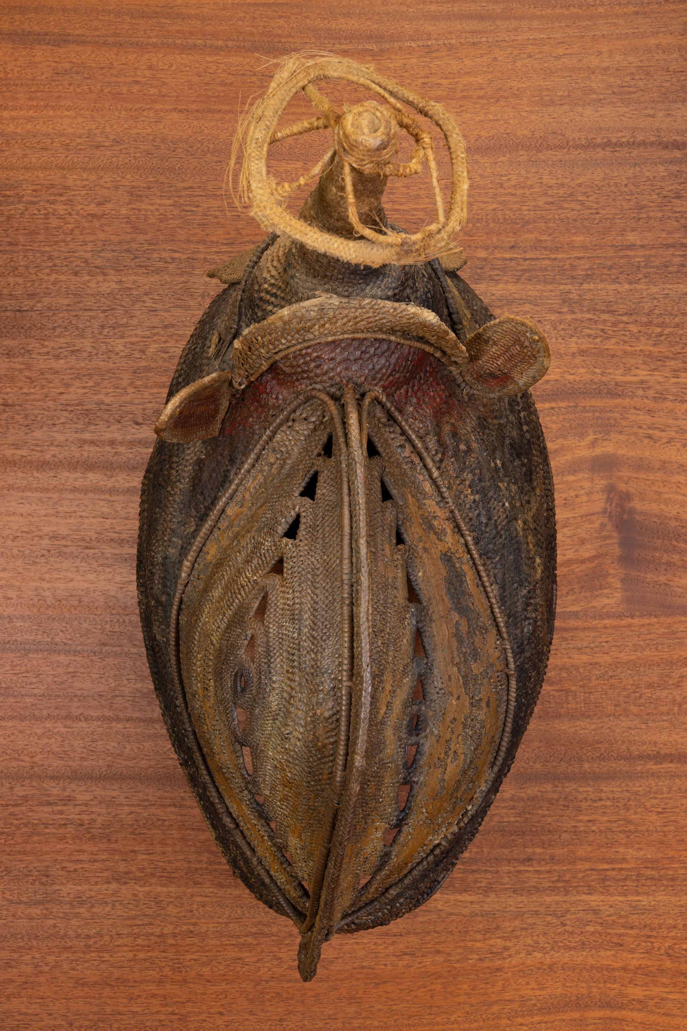 Painted basketry baba (spirit) masks, intricately crafted by skilled Abelam artisans in New Guinea's Maprik region, play a significant role in adolescent initiation rites. For the Abelam, these ceremonies mark a young boy’s entry into manhood, with the initiate donning a ceremonial mask as he undergoes a symbolic transformation. Part of the process involves ritual bloodletting, intended to remove the “female blood” inherited from his mother and to prepare him for adulthood. Wearing this plaited rattan mask, the initiate impersonates the spirits of female ancestors, embodying the essence of his heritage.