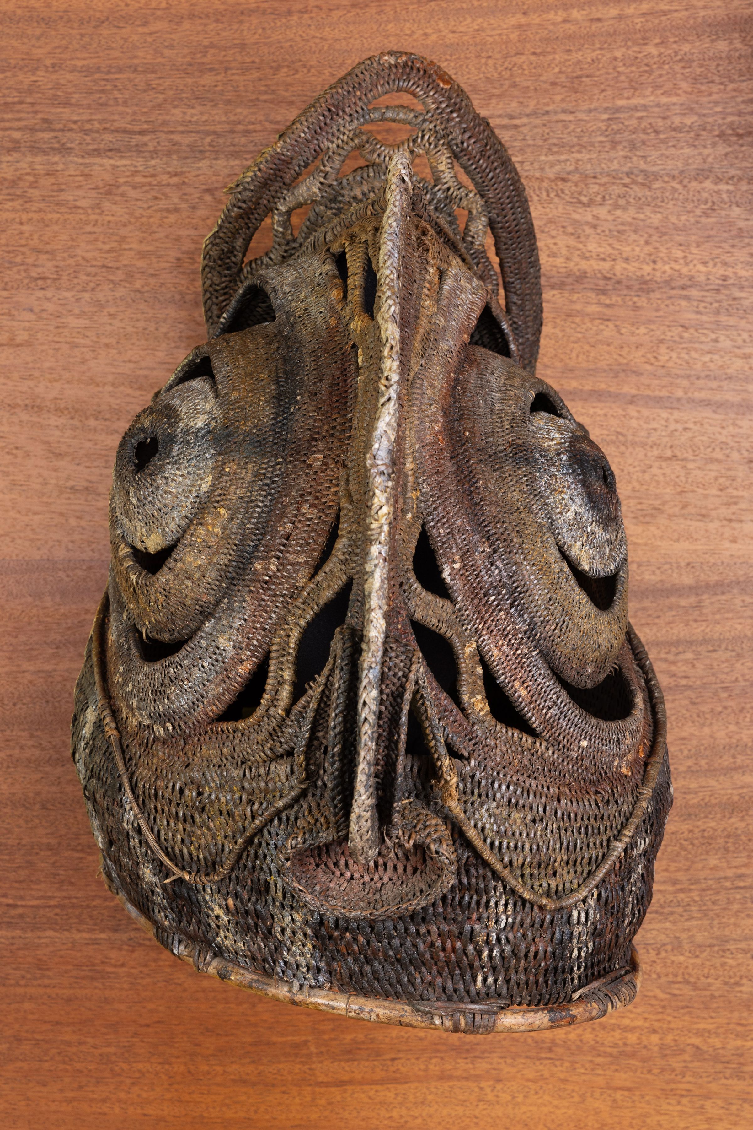 Painted basketry baba (spirit) masks, intricately crafted by skilled Abelam artisans in New Guinea's Maprik region, play a significant role in adolescent initiation rites. For the Abelam, these ceremonies mark a young boy’s entry into manhood, with the initiate donning a ceremonial mask as he undergoes a symbolic transformation. Part of the process involves ritual bloodletting, intended to remove the “female blood” inherited from his mother and to prepare him for adulthood. Wearing this plaited rattan mask, the initiate impersonates the spirits of female ancestors, embodying the essence of his heritage.