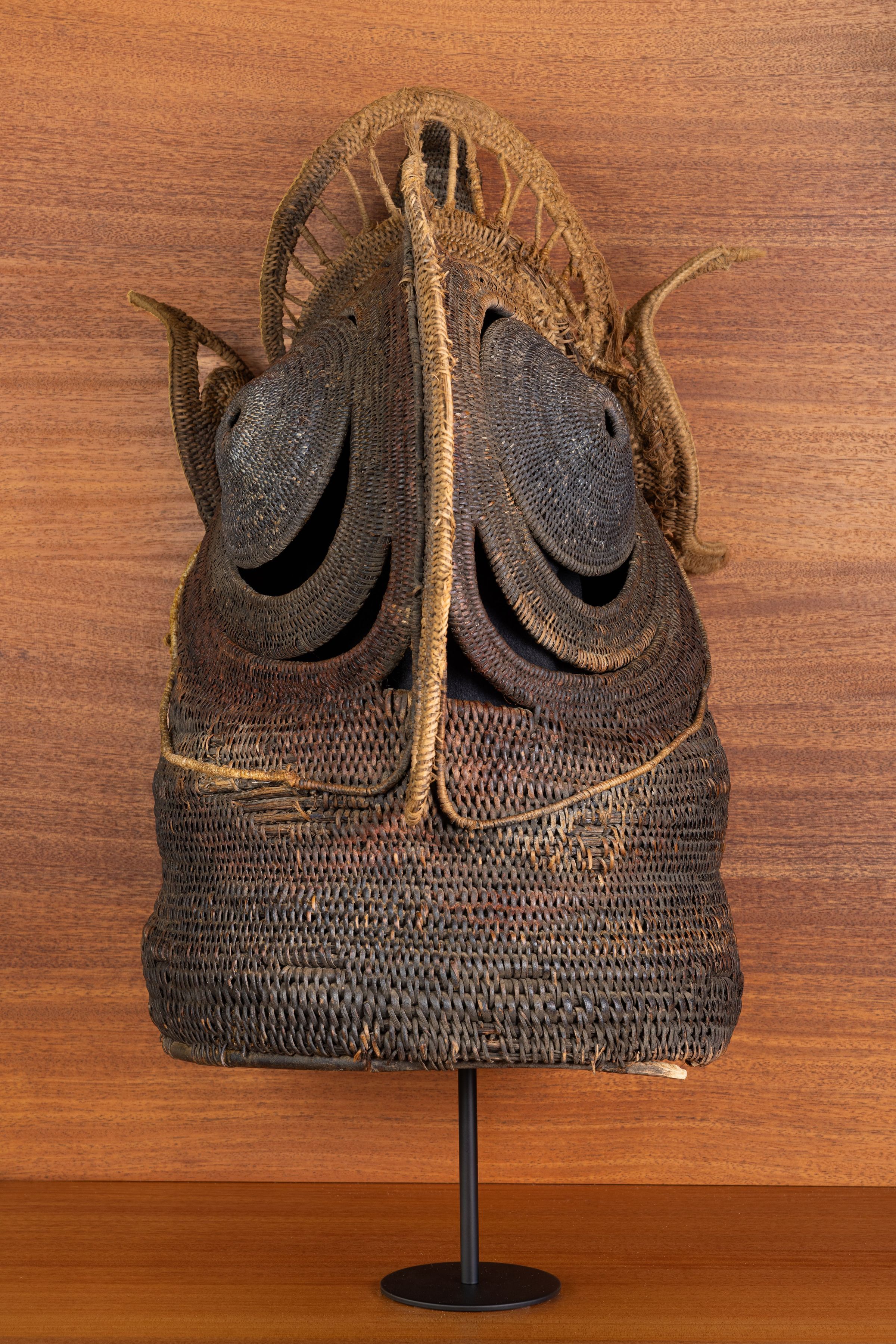This recently restored mask features a short, wide horn protruding from the rounded forehead flanked by two ear flaps, above a small, openwork visor. Below, two raised eyes flank a center ridge, each surrounded by pierced concentric crescent eye slits, accented with faded red pigments, creating a striking visual composition. Part of the Mauna Kea's captivating collection of woven Abelam tribe masks, this piece invites guests to consider the rich and nuanced cultural traditions of another island nation across the Pacific.