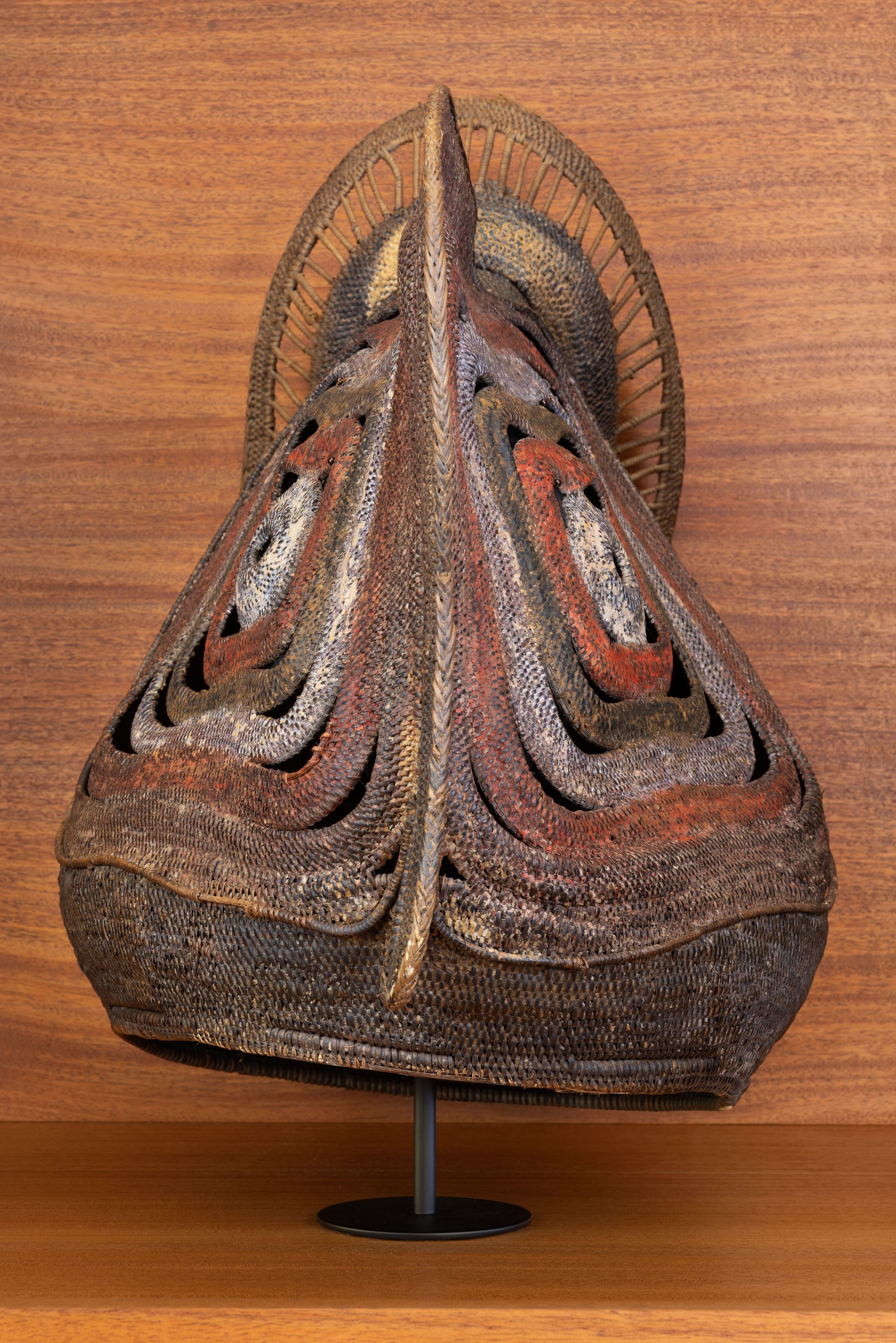 Painted basketry baba (spirit) masks, intricately crafted by skilled Abelam artisans in New Guinea's Maprik region, play a significant role in adolescent initiation rites. For the Abelam, these ceremonies mark a young boy’s entry into manhood, with the initiate donning a ceremonial mask as he undergoes a symbolic transformation. Part of the process involves ritual bloodletting, intended to remove the “female blood” inherited from his mother and to prepare him for adulthood. Wearing this plaited rattan mask, the initiate impersonates the spirits of female ancestors, embodying the essence of his heritage.