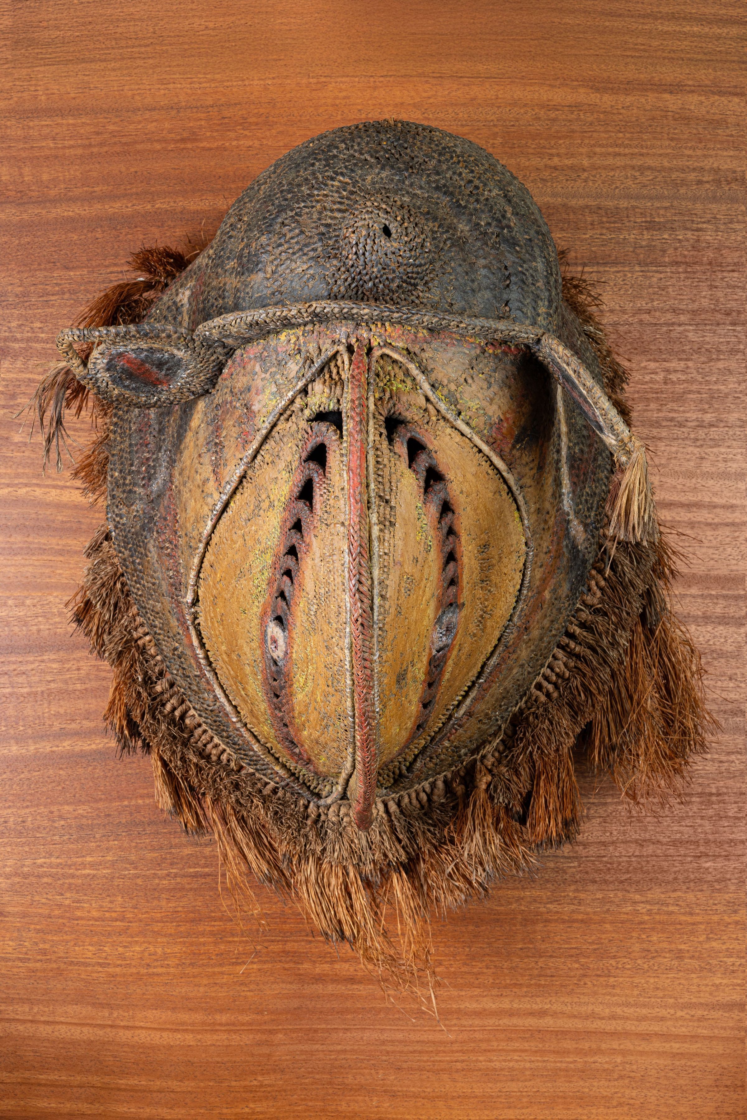 Painted basketry baba (spirit) masks, intricately crafted by skilled Abelam artisans in New Guinea's Maprik region, play a significant role in adolescent initiation rites. For the Abelam, these ceremonies mark a young boy’s entry into manhood, with the initiate donning a ceremonial mask as he undergoes a symbolic transformation. Part of the process involves ritual bloodletting, intended to remove the “female blood” inherited from his mother and to prepare him for adulthood. Wearing this plaited rattan mask, the initiate impersonates the spirits of female ancestors, embodying the essence of his heritage.