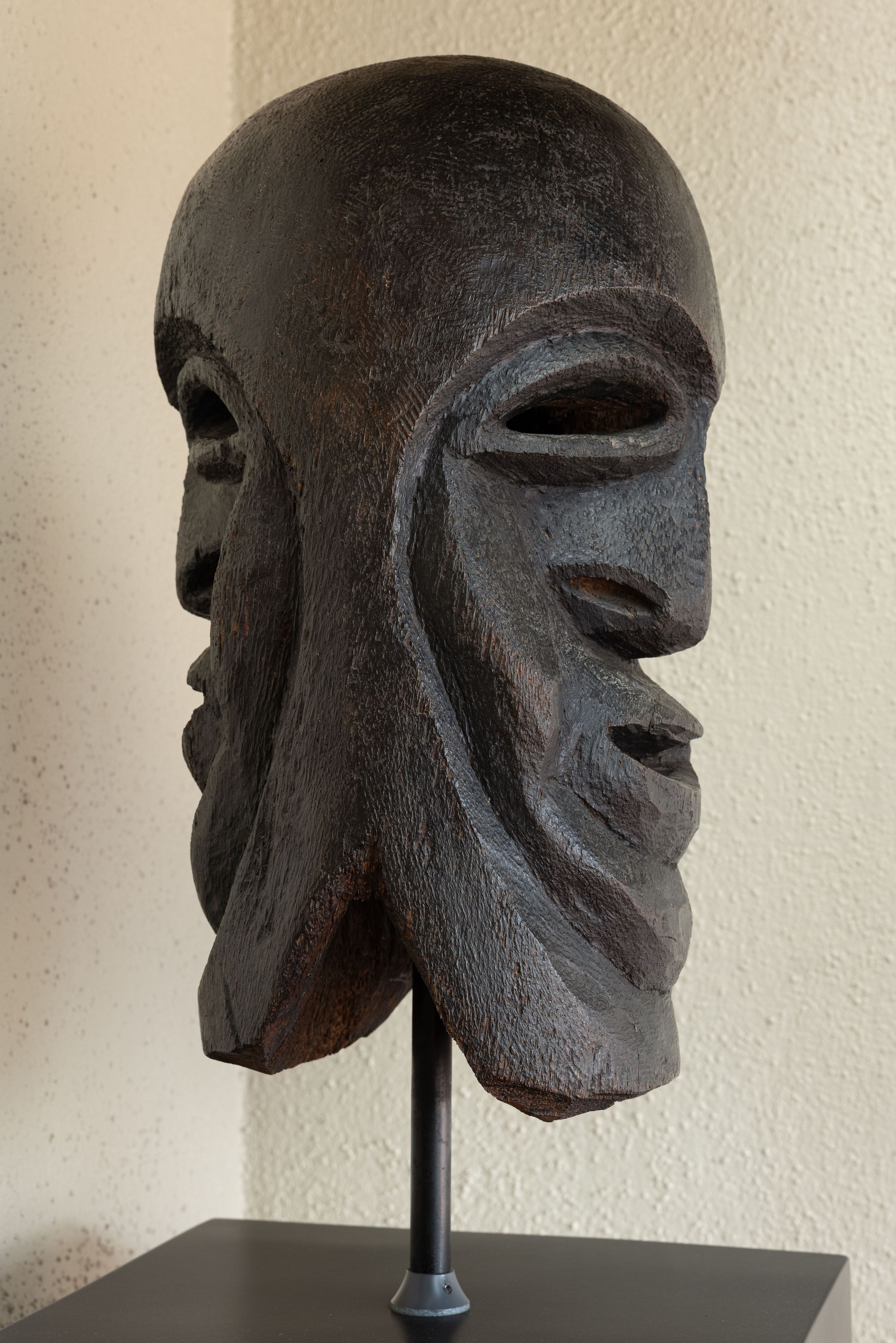 Likely used in one of such secret societies, this mask's featuring two faces could symbolize the dual nature of beings or the merging of opposing forces in the culture's worldview. These masks, often worn during ceremonies and initiations, may represent the blending of human and animal spirits, or the interplay of good and evil, life and death. The two-faced design may also reflect the concept of transformation, where individuals adopt the form of another being to access their powers or capabilities.