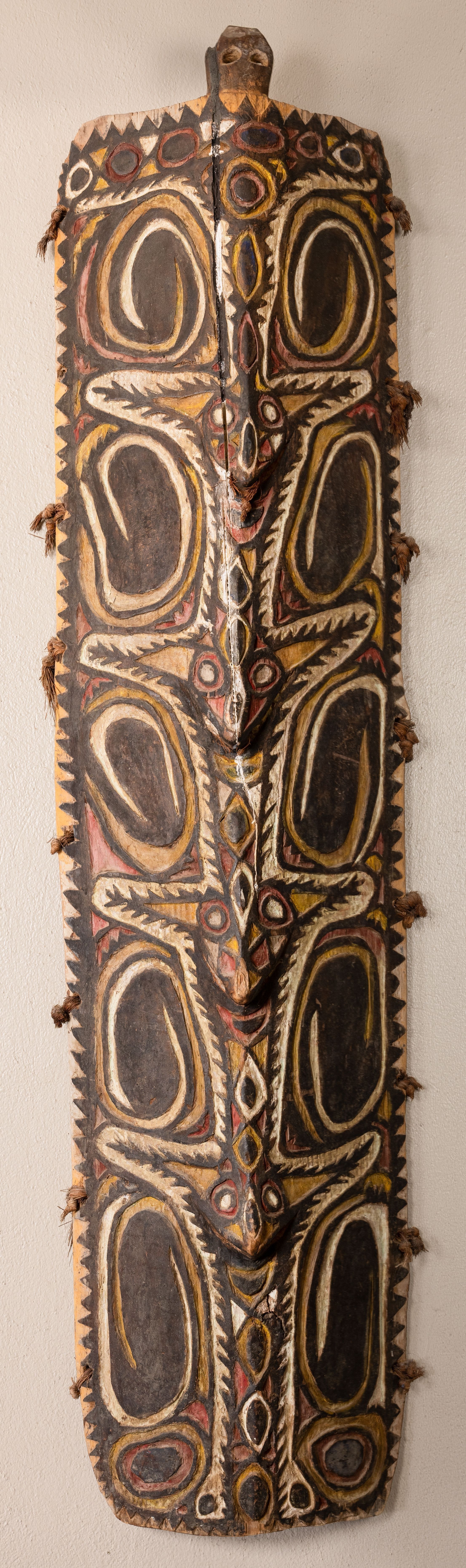 Biwat shields, such as this one, are celebrated for their intricate low-relief carvings and vibrant pigmentation.