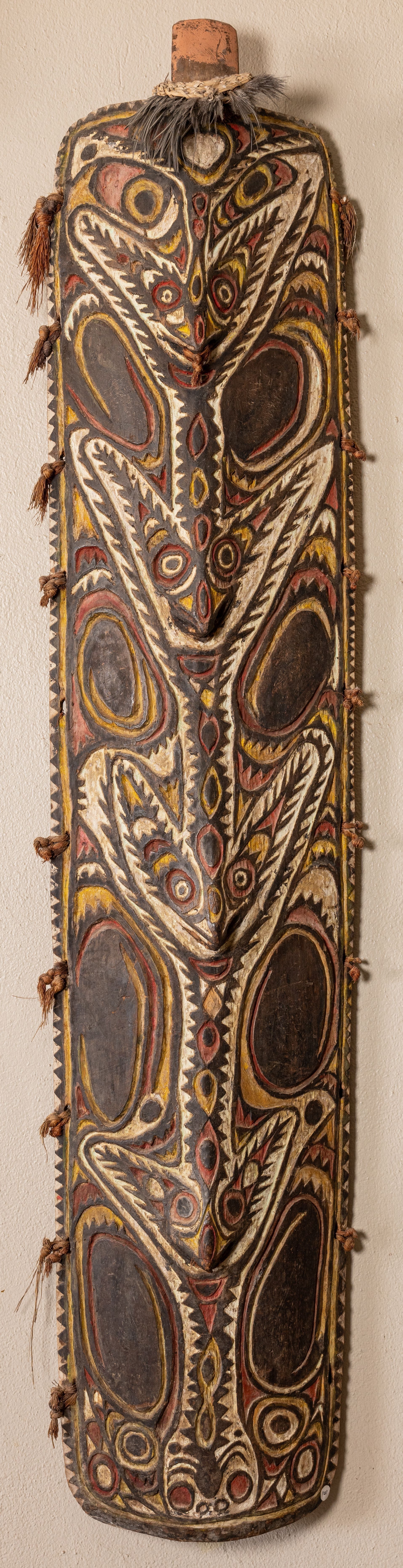 Biwat shields, such as this one, are celebrated for their intricate low-relief carvings and vibrant pigmentation.