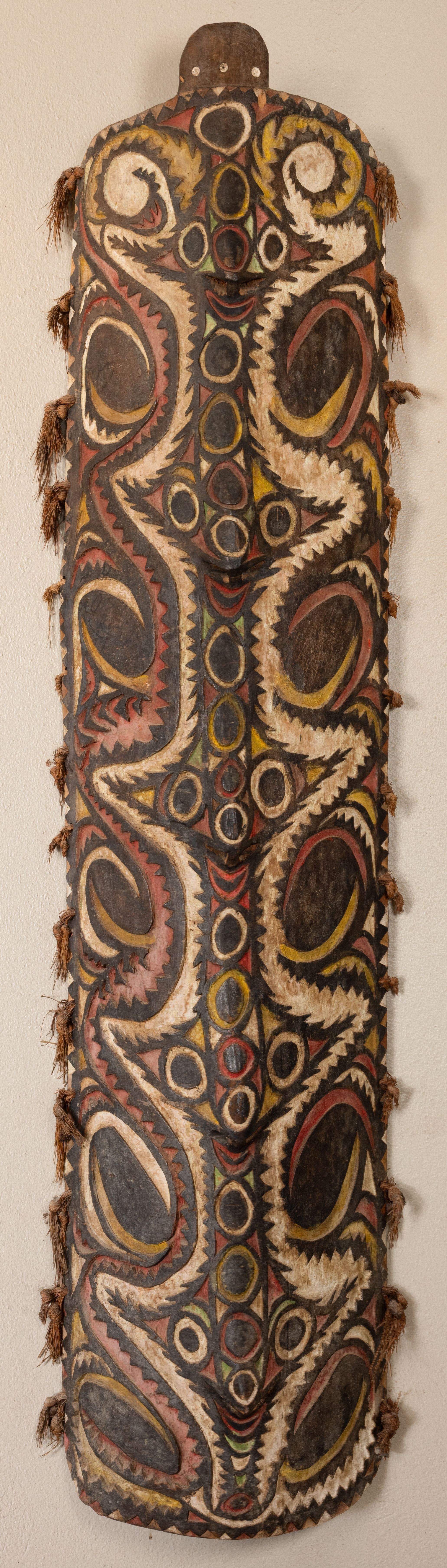 Biwat shields, such as this one, are celebrated for their intricate low-relief carvings and vibrant pigmentation.
