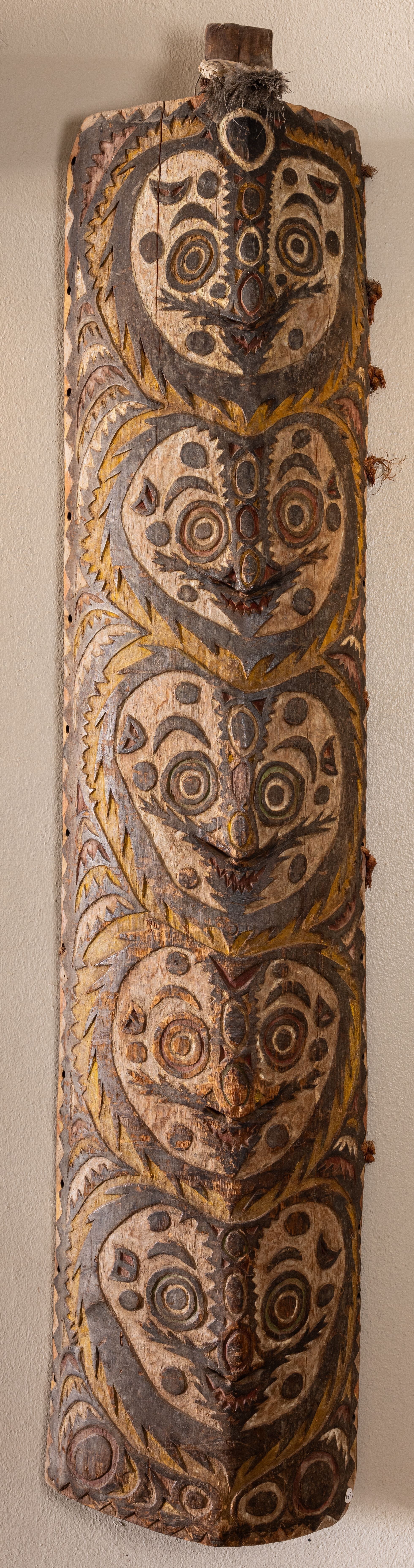 This particular shield bears low-relief carvings featuring five masks, each accentuated with pigments. The serrated and curved lines create a dazzling effect intended to ward off enemies and embody the collective tribal identity. The craftsmanship of the piece, with its expressive eyes and tongues on the carved faces, reflects the deep cultural and spiritual essence of the Biwat people, offering a tangible connection to their rich heritage.