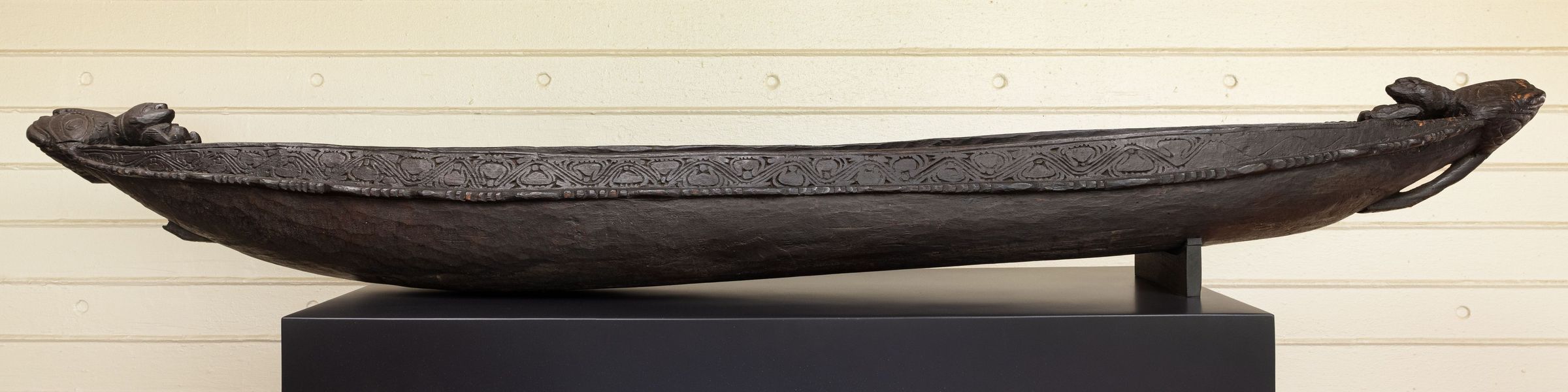 The body of the wooden model, stained dark, displays crocodile and human forms arong the rim, alongside an exquisite serpentine design. Meanwhile inside, female figures squat in birthing positions at either end of the canoe, thought to represent clan ancestors or possibly reflect the Siassi islanders' creation myths.