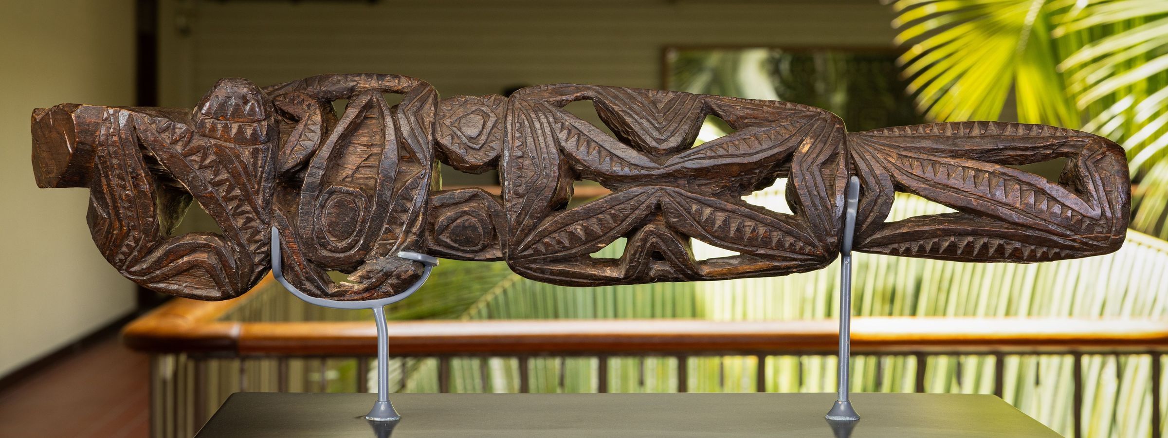 Traditionally, the prows of these canoes are carved in intricate designs, as is the case with the beautifully crafted openwork geometric decorating this canoe prow. Thus, this piece stands as a tangible link to the rich heritage of the Sepik River area, reflecting the enduring legacy of craftsmanship and local tradition.