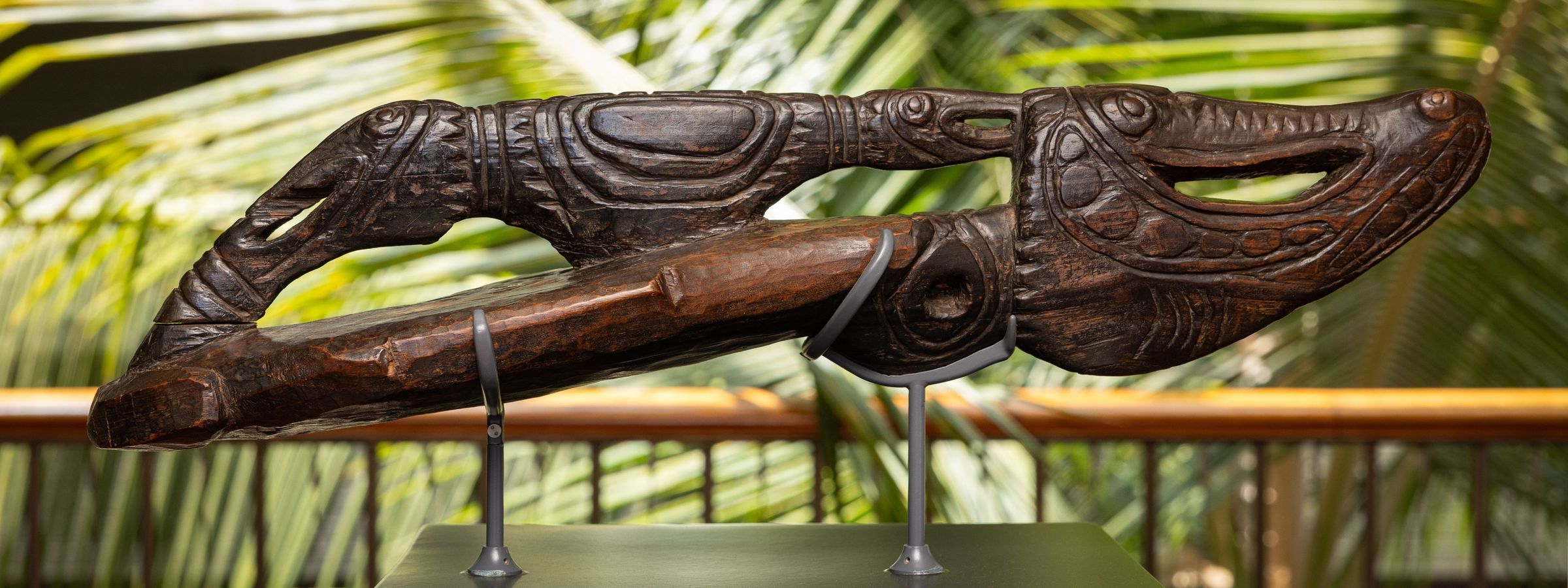 Crocodiles hold a central role in the art and culture of the Upper Sepik Rivers, likely due to the prevalence of these animals in the region: indeed, one local creation account attributes the formation of the land to an ancestral crocodile. Reflecting this profound connection, the prows of canoes, such as the one showcased here, are often intricately carved in the likeness of a crocodile.