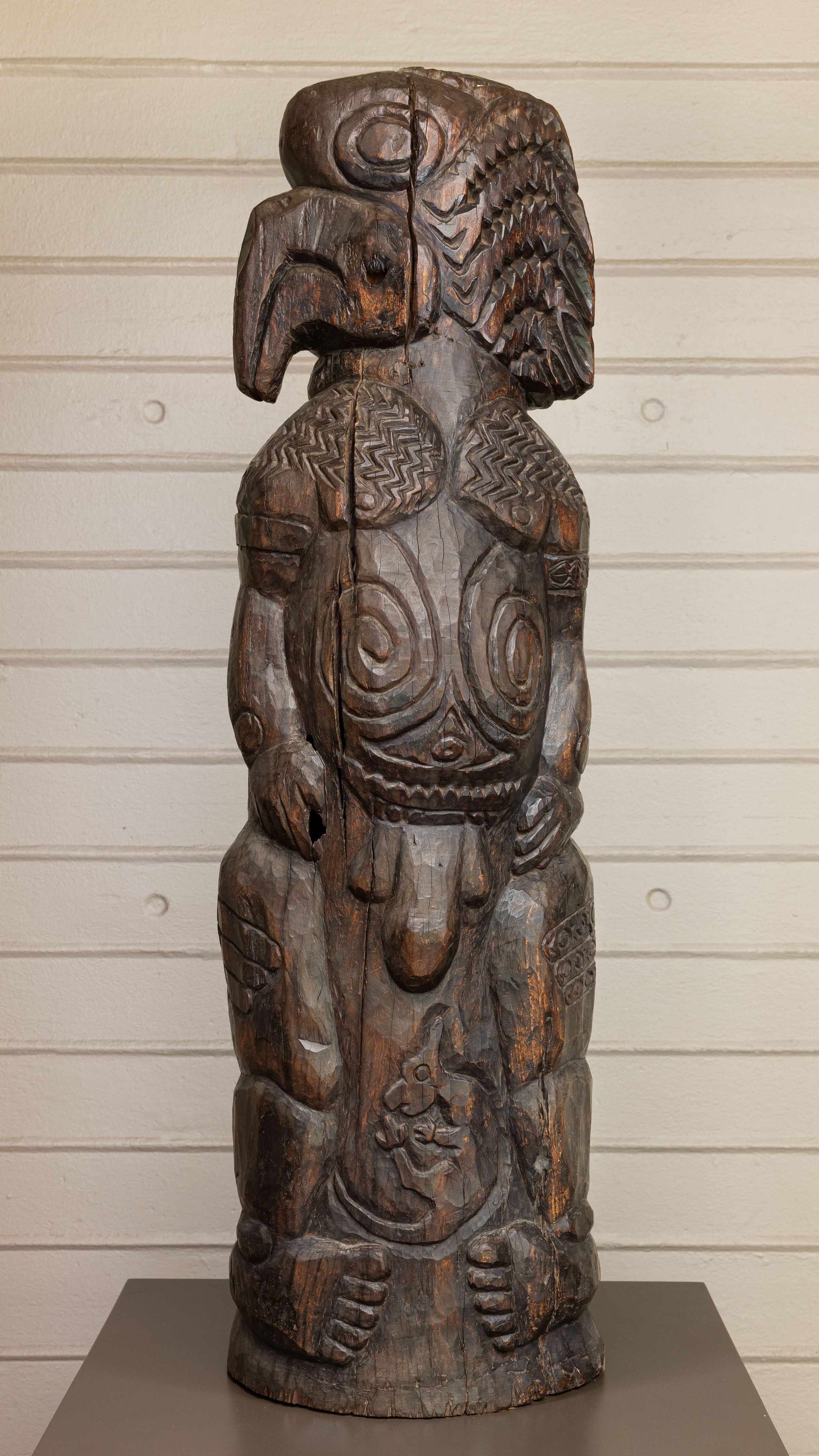 The diverse peoples of the Middle Sepik River are organized into various clans, each tied to specific ancestors and totemic species: these totemic and ancestral beings are represented through wooden figures, designed in the form of potent and formidable ancestral beings known locally as wan or waken. Each figure, belonging to a particular clan, is named after a significant ancestor of that clan, and kept enshrined in men’s ceremonial houses.
