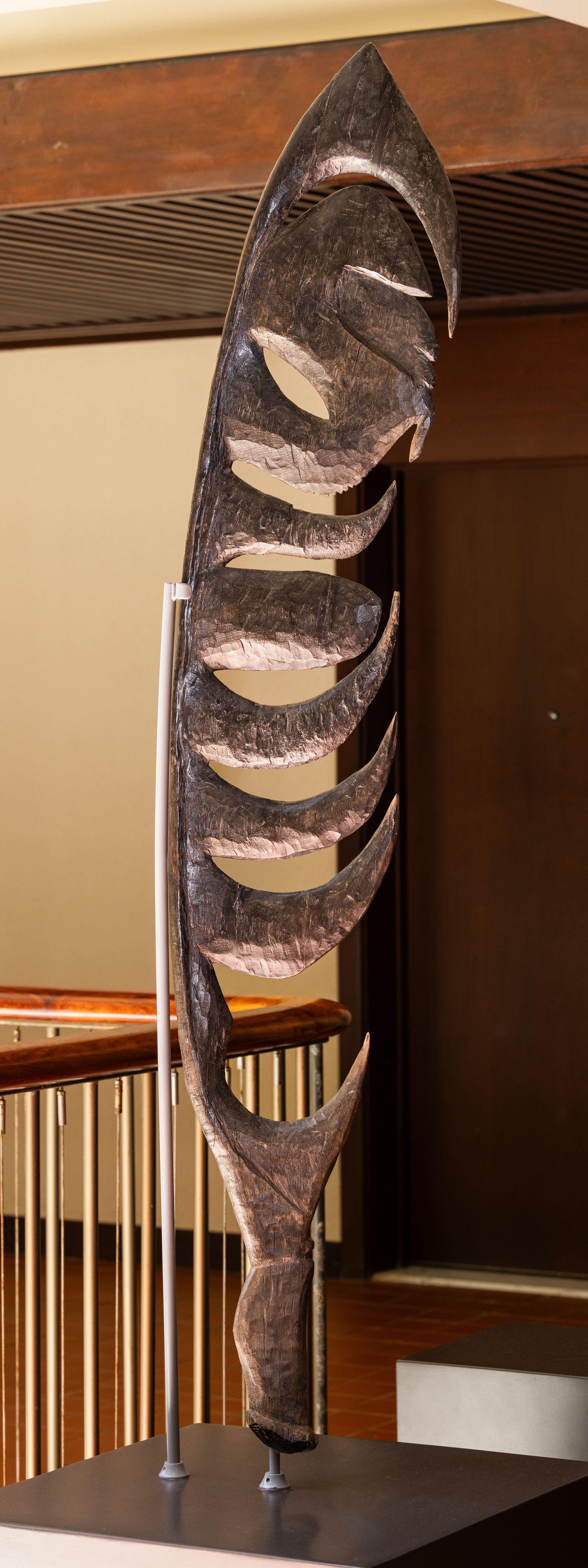 This particular Yipwon, one of three on display at the Mauna Kea, reflects the artistic finesse of the opposed-hooks style and boasts a human head in profile accompanied by a mesmerizing series of curvilinear forms below. This large, ornate Yipwon would have been a collective possession of clans, while smaller portable counterparts served as individual amulets. Carried in net bags by their owners, these charms and their linked larger Yipwons are believed to bring success in hunting and battle, embodying the intertwining threads of artistry, mythology, and spirituality within the diverse tapestry of New Guinea's cultural heritage.