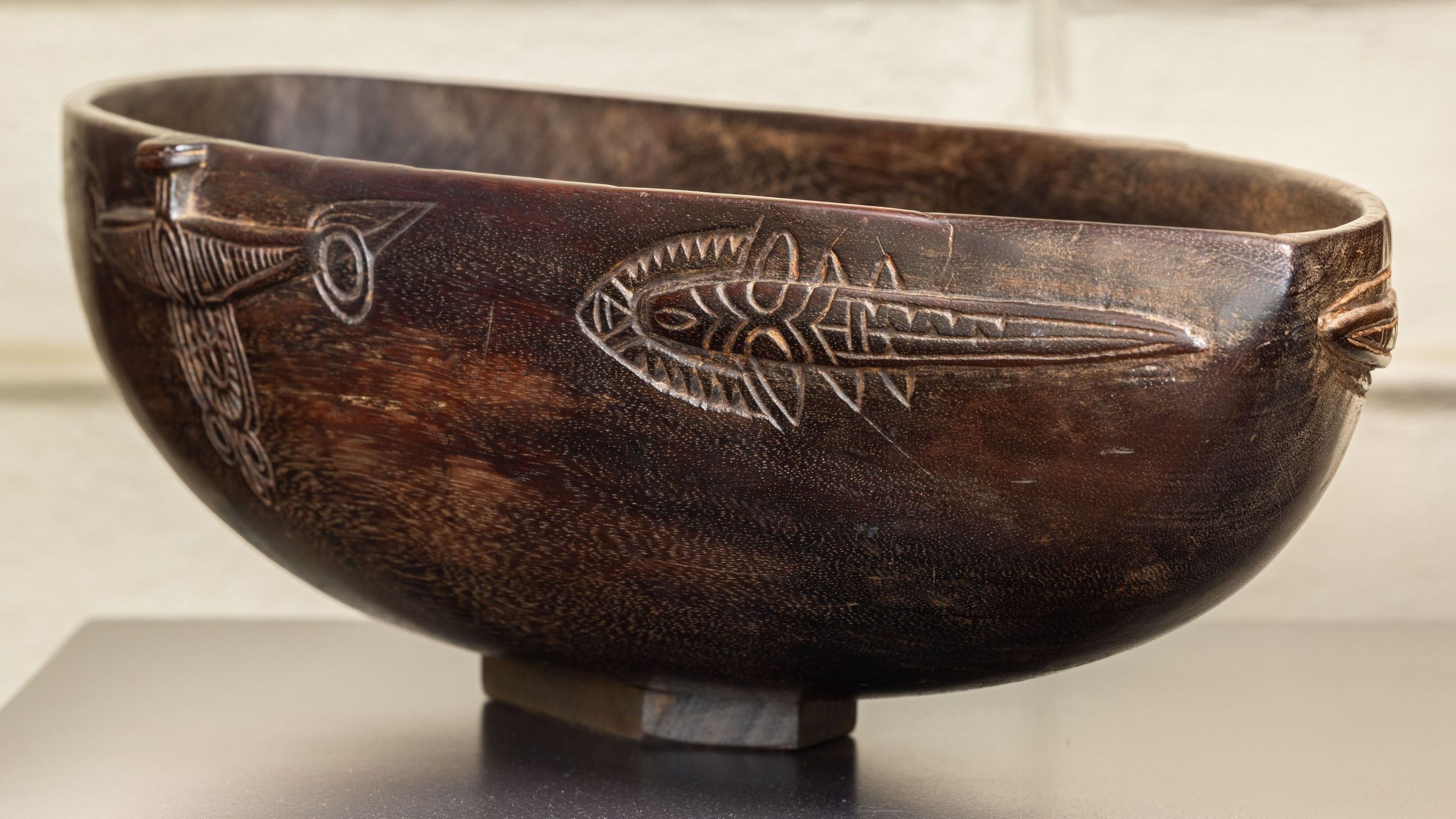Characterized by its rounded sides and meticulously hollowed interior, this bowl exudes both practicality and artistic allure. Adorning the sides of the vessel are intricate motifs carved in low relief, featuring circular and curved designs evoking abstracted fish. Each detail of the carving speaks to the skill and creativity of the artisan, capturing the essence of New Guinean artistry.