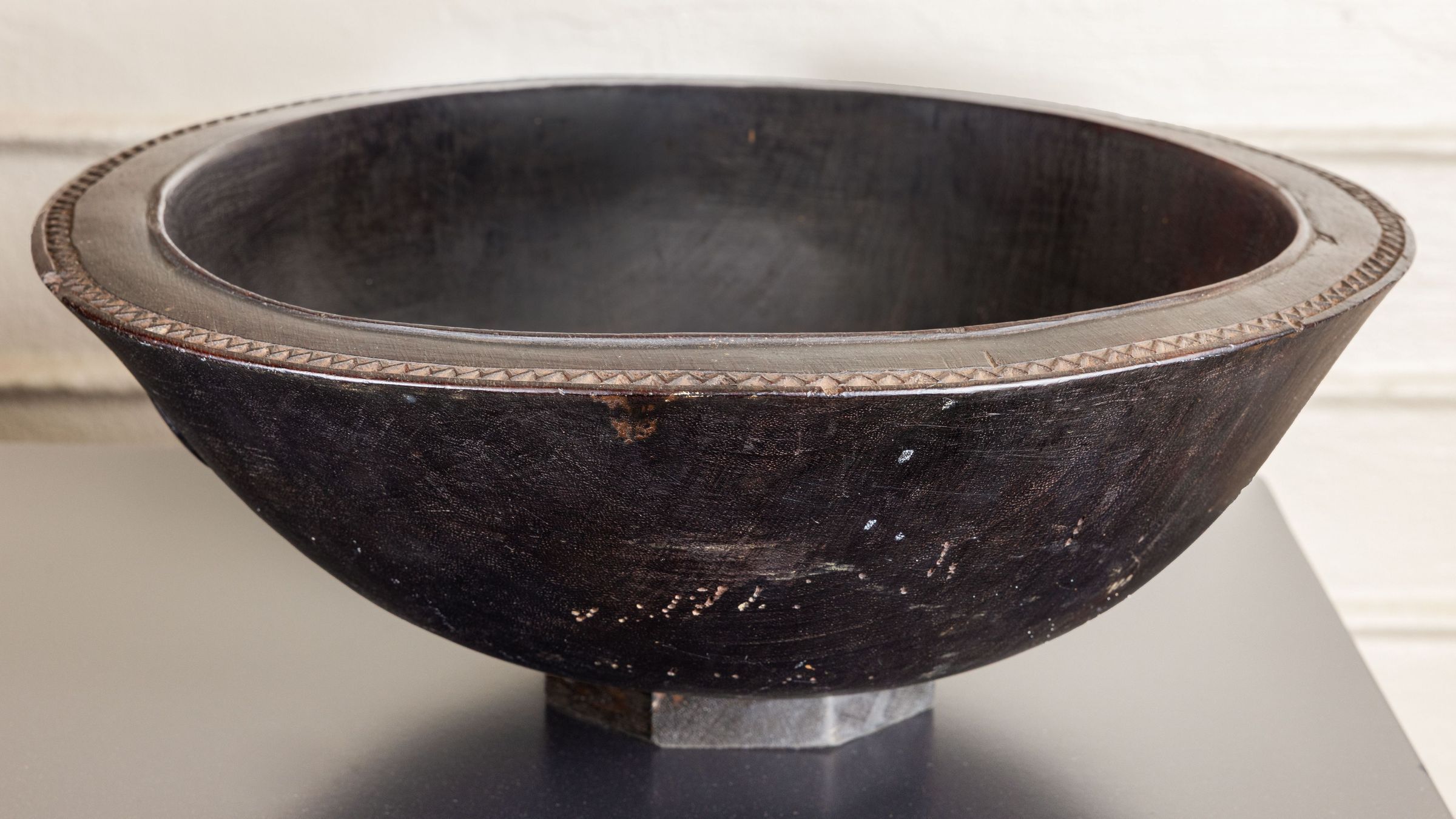 This dark wooden circular bowl from New Guinea showcases a rounded bottom and a flat rim adorned with a border of intricate continuous zigzags. Enhancing both functionality and aesthetic appeal, this bowl features two low handles at the sides, providing ease of handling and adding a touch of elegance to its design.