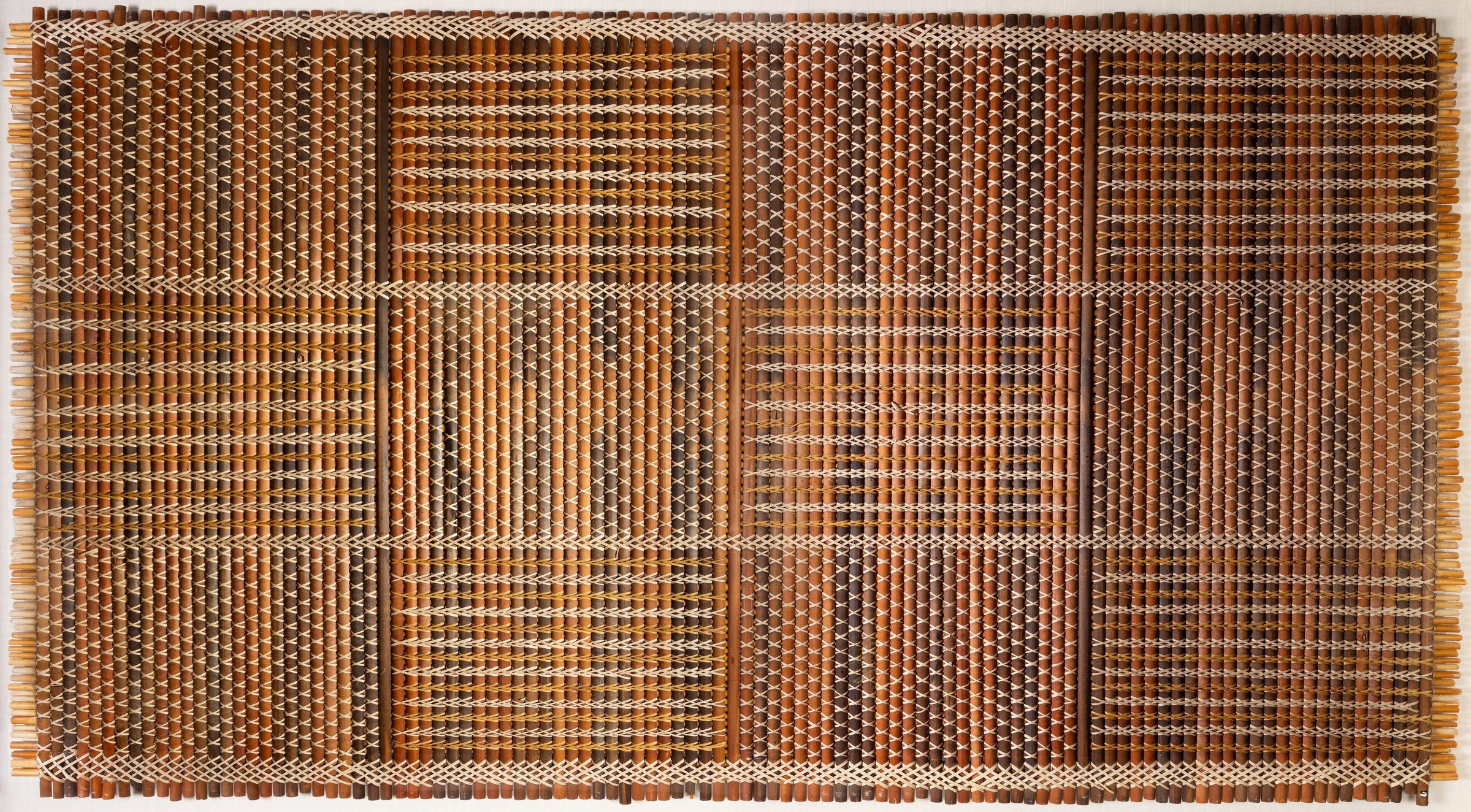 This tukutuku panel is a contemporary example of Māori weaving from Aoteroa (New Zealand), made from colored reeds lashed to a backing to form a striking geometric chequered pattern.