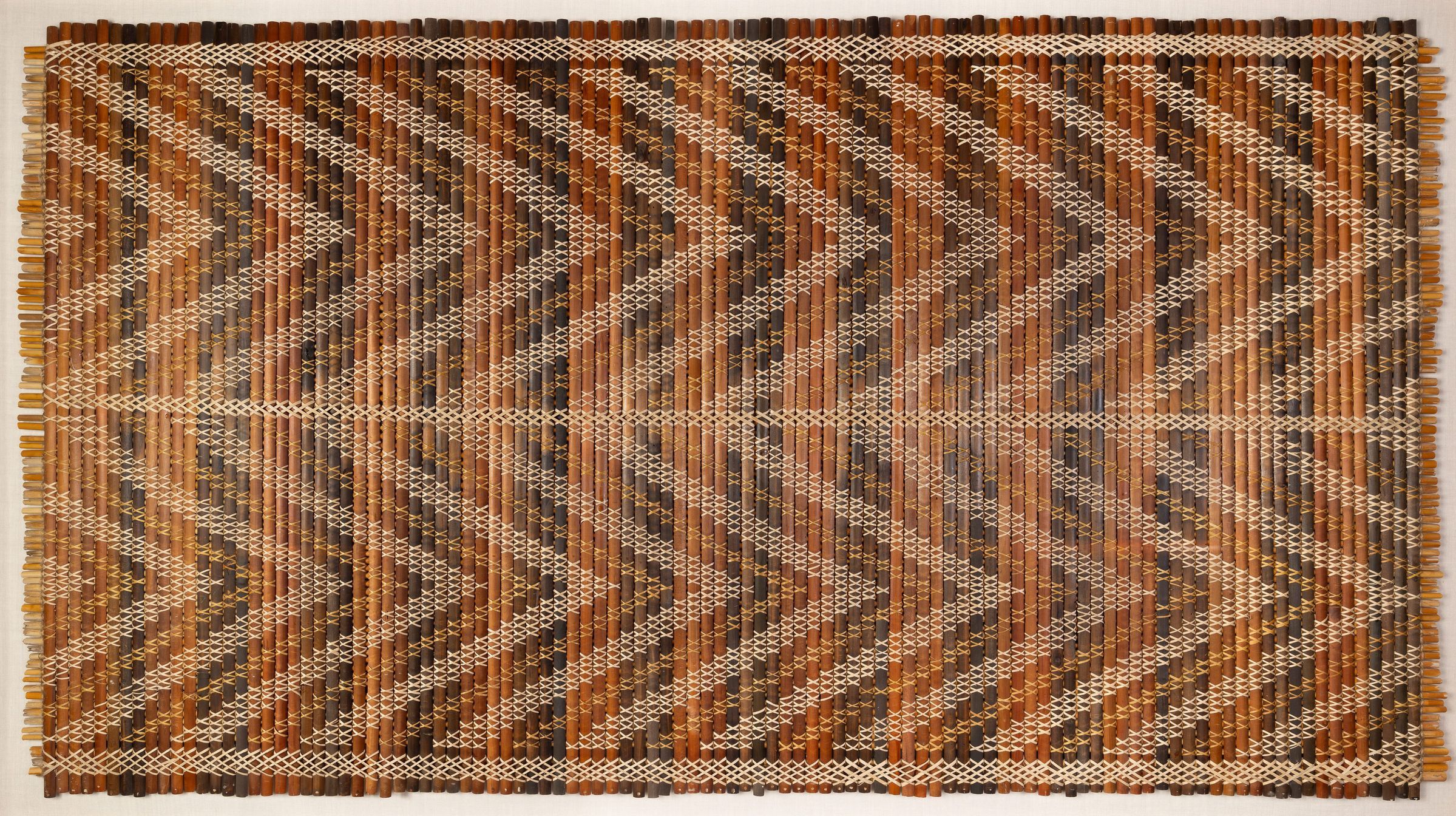 This tukutuku panel is a contemporary example of Māori weaving from Aoteroa (New Zealand), made from colored reeds lashed to a backing to form a striking horizontal chevron pattern.