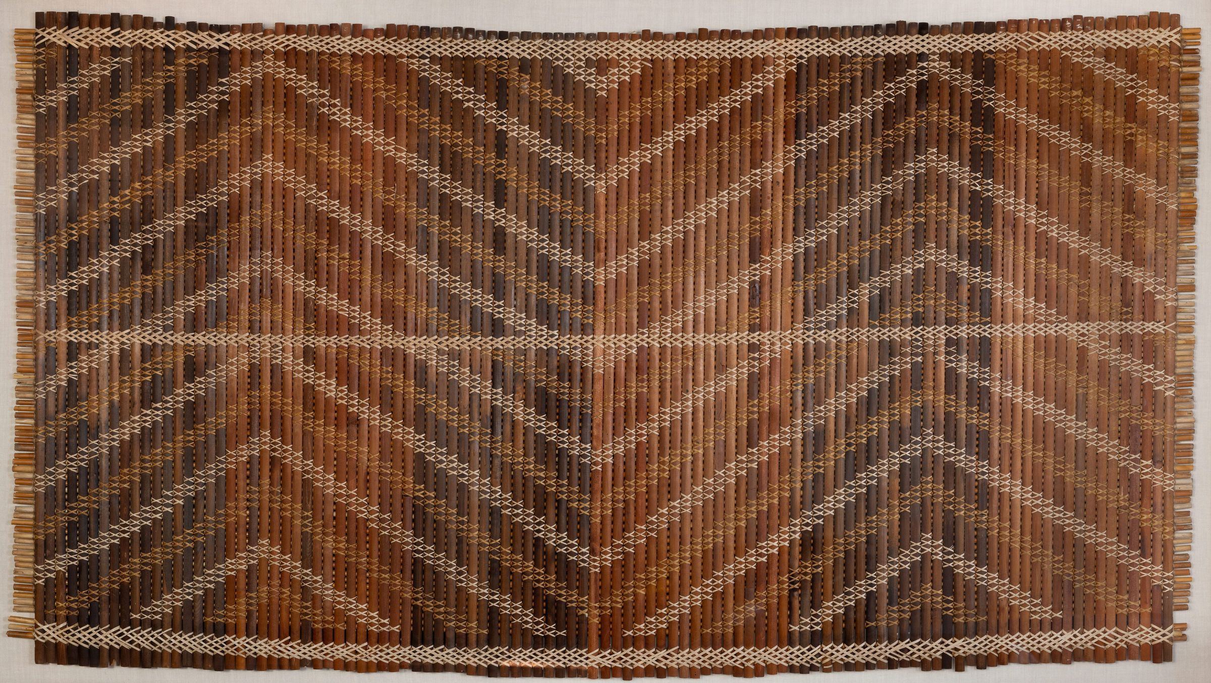 This tukutuku panel is a contemporary example of Māori weaving from Aoteroa (New Zealand), made from colored reeds lashed to a backing to form a striking vertical chevron pattern.