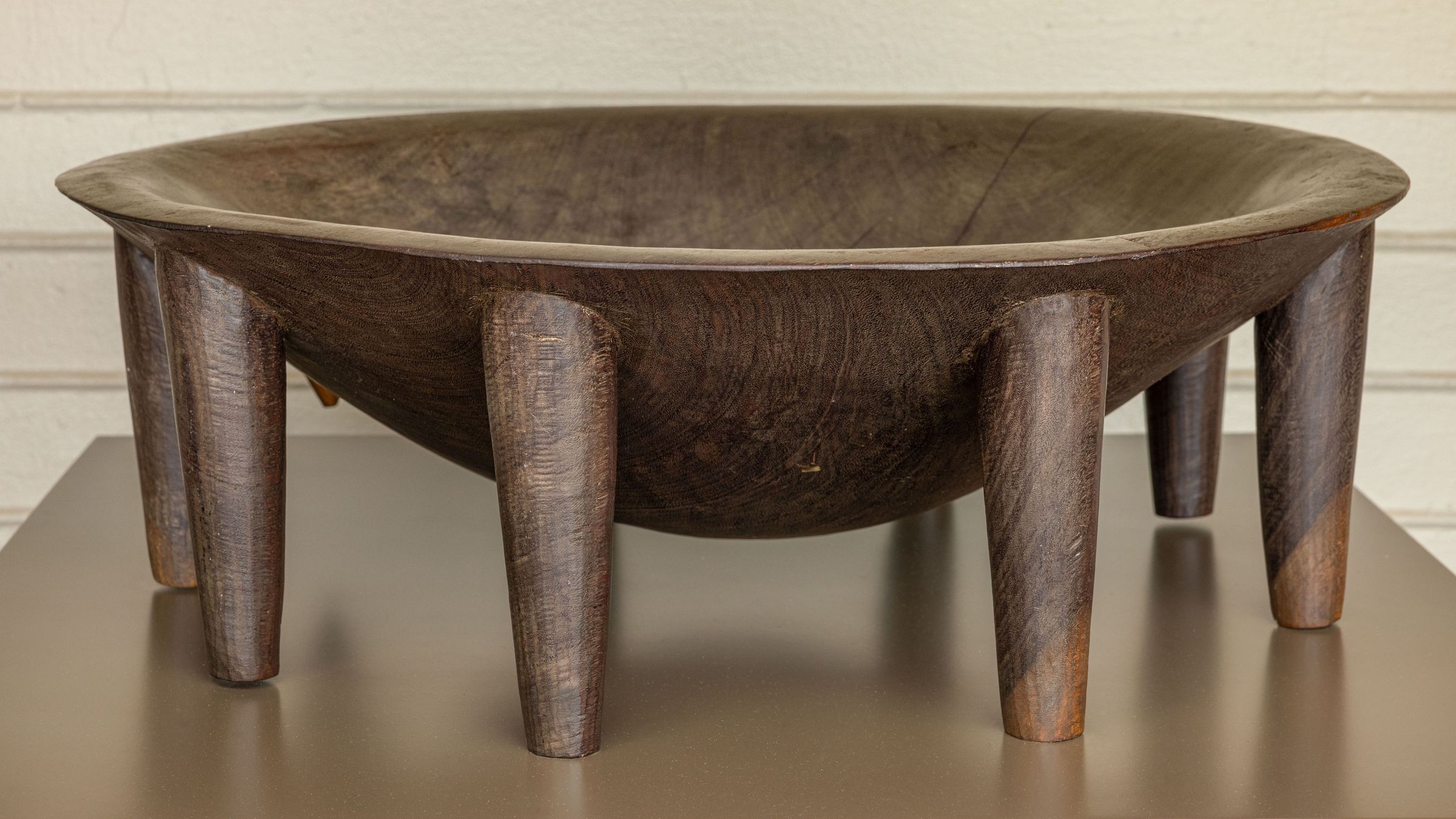The drink is served in Kava bowls such as this finely carved and smooth piece. While these bowls traditionally have four legs, they can range in size for larger ceremonies, as shown in this eight-legged artefact. As is traditional, two triangular panels suspend from the bottom rim of the bowl.