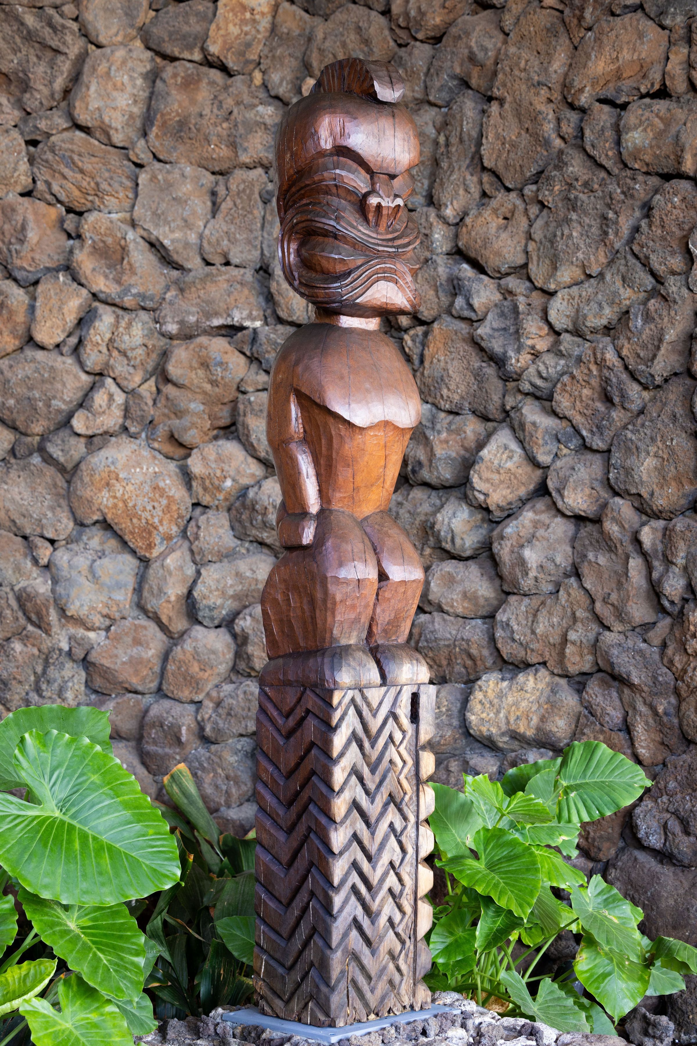 This is one of two modern Hawaiian wooden carvings of Hawaiian god images. Both are carved in the recogniseable Kona style - with grimacing expressions, thick, short bodies, and flexed arms and legs. Each sculptue is also reaised on a square base with deep chevron grooves, carved from the same tree trunk as the god image.