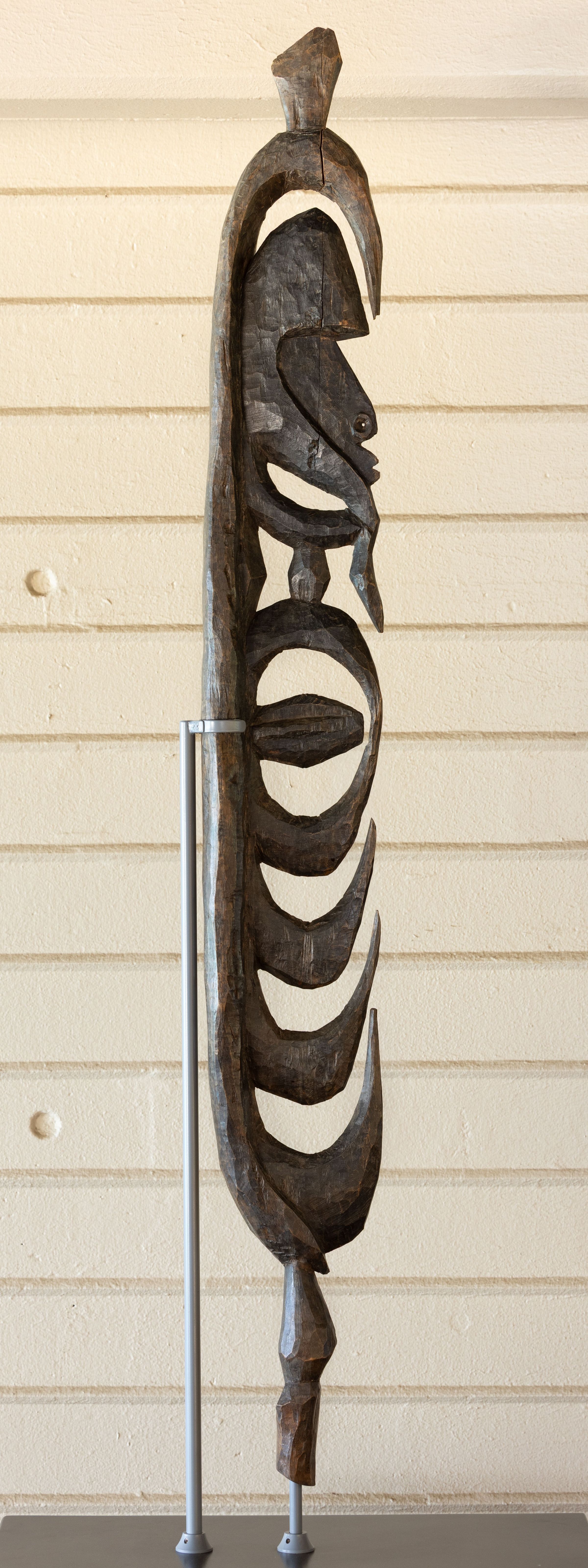 This particular Yipwon, one of three on display at the Mauna Kea, reflects the artistic finesse of the opposed-hooks style, boasting a human head in profile accompanied by a mesmerizing series of pierced curvilinear forms below.