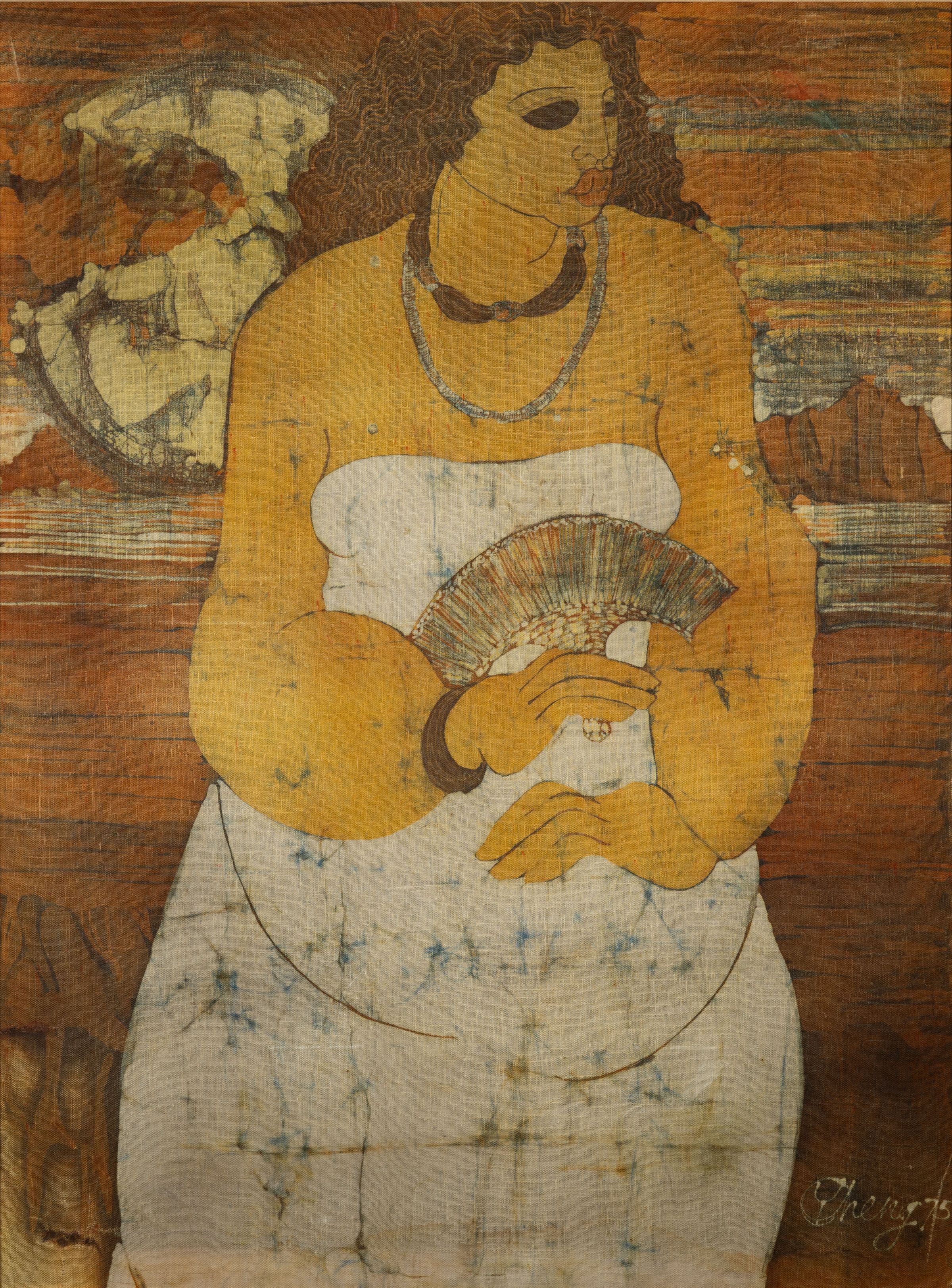 This scarce and striking artwork by Yvonne Cheng exemplifies the fusion of traditional craft and modern vision. The composition features a woman holding a fan with the full moon behind her, rendered in warm tones and textured patterns. Cheng's work is recognized for its powerful and graceful portrayal of women.