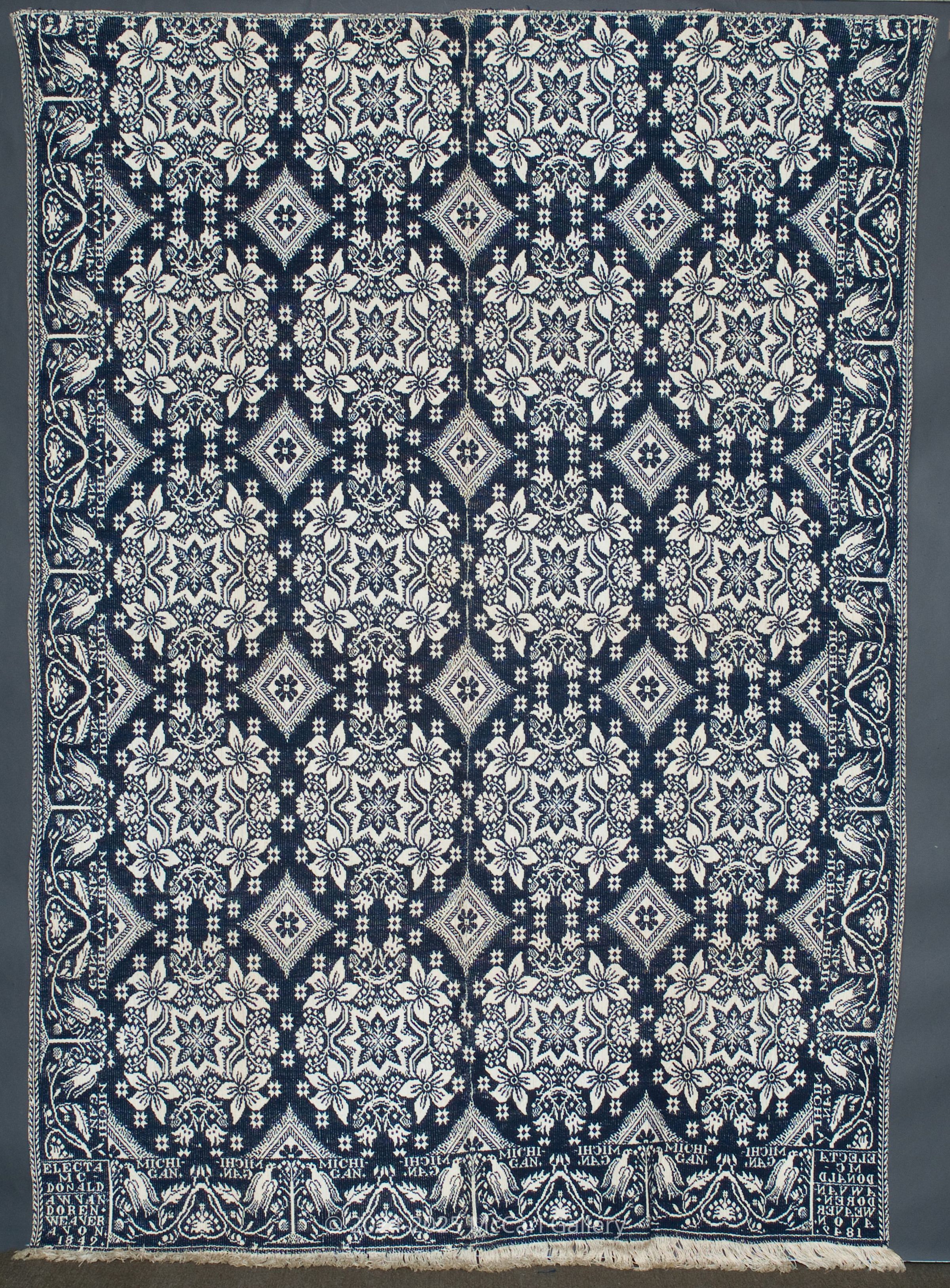 double weave; navy and natural; two loom widths joined; fringe on bottom; floral and star motif centerfield; repeating bird and tree border; the word michigan repeats on border; signature corner blocks in LL LRCollection