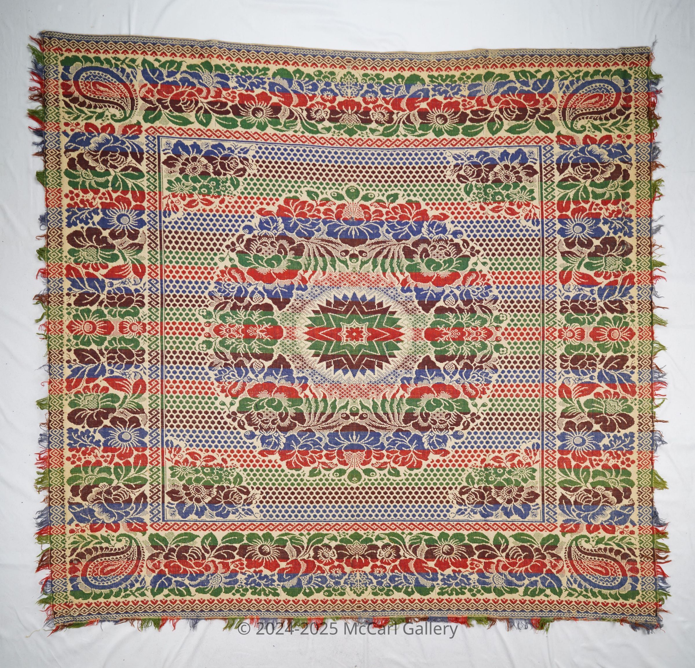 Natural, blue, red, and green figured doubleweave coverlet; seamless. Fringe on three sides; border on four sides.