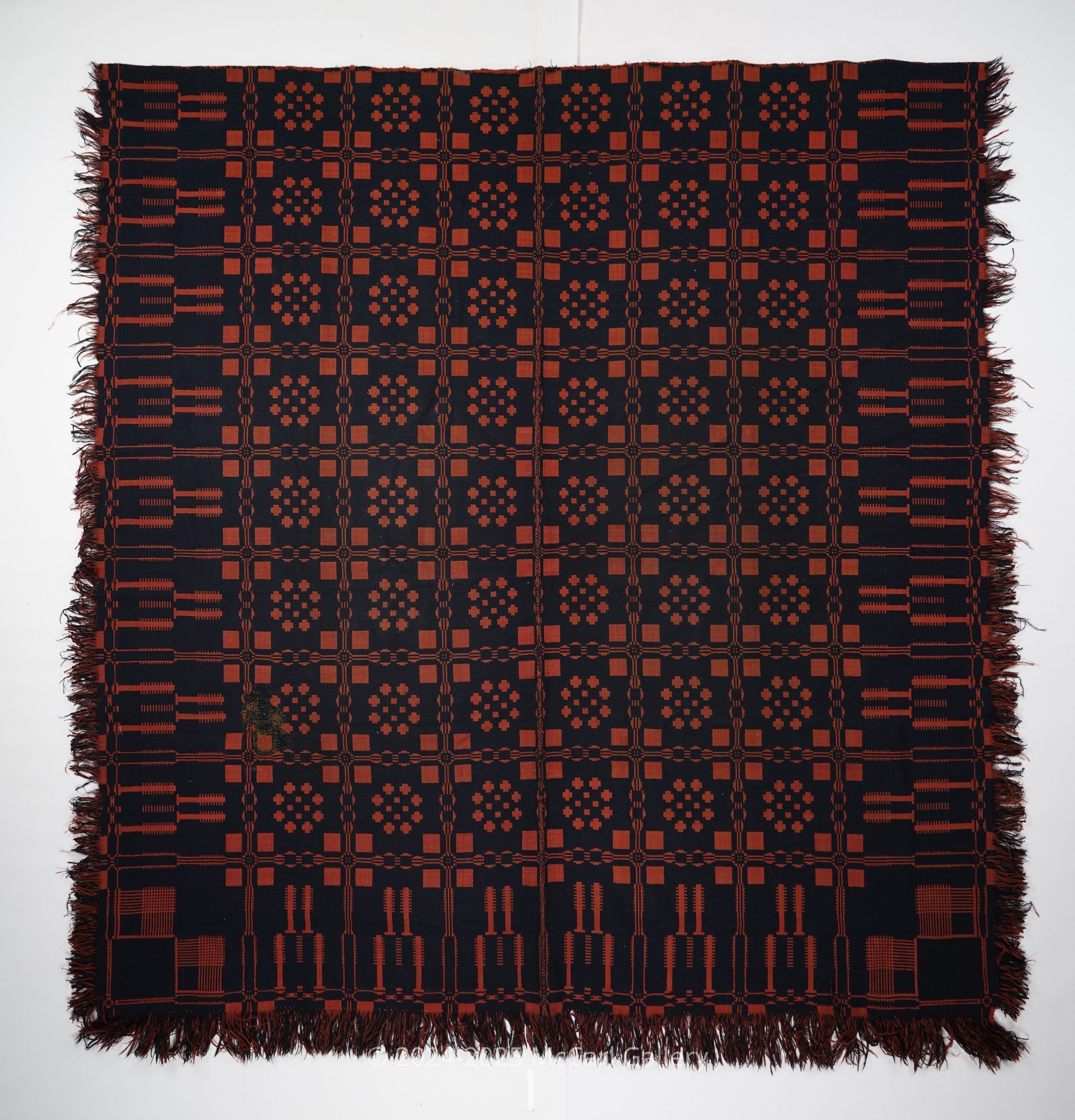 Red and navy geometric double weave coverlet with border and applied fringe on three sides. Two joined panels.