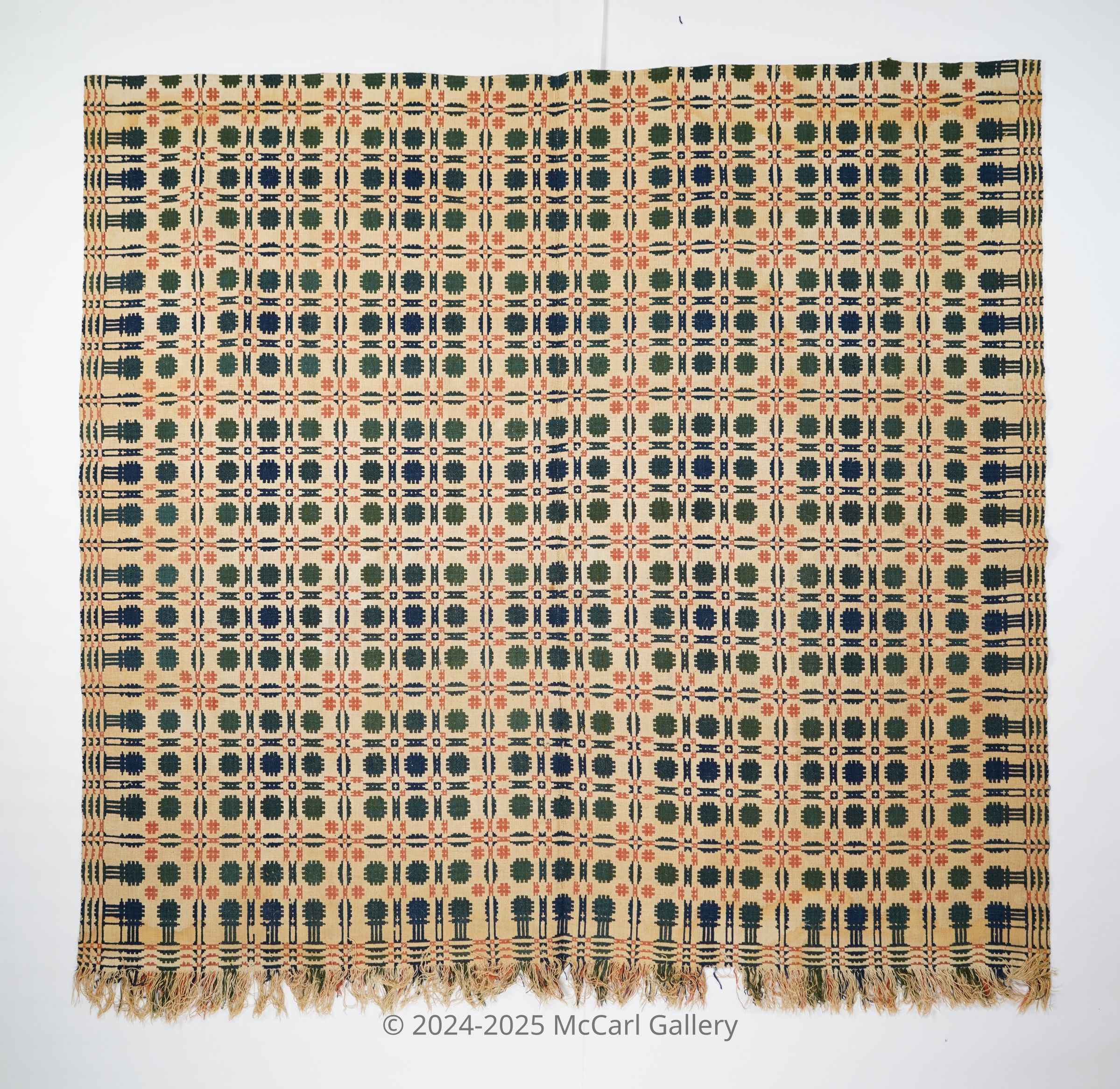 Red, green, navy, and natural geometric double weave coverlet with border on three sides and self-fringe along bottom. Two joined panels.Collection