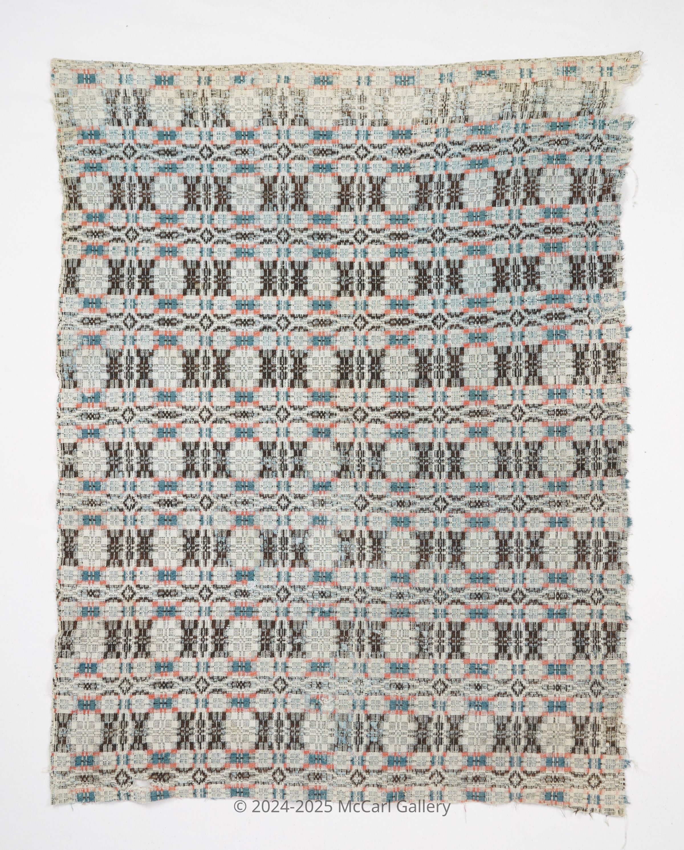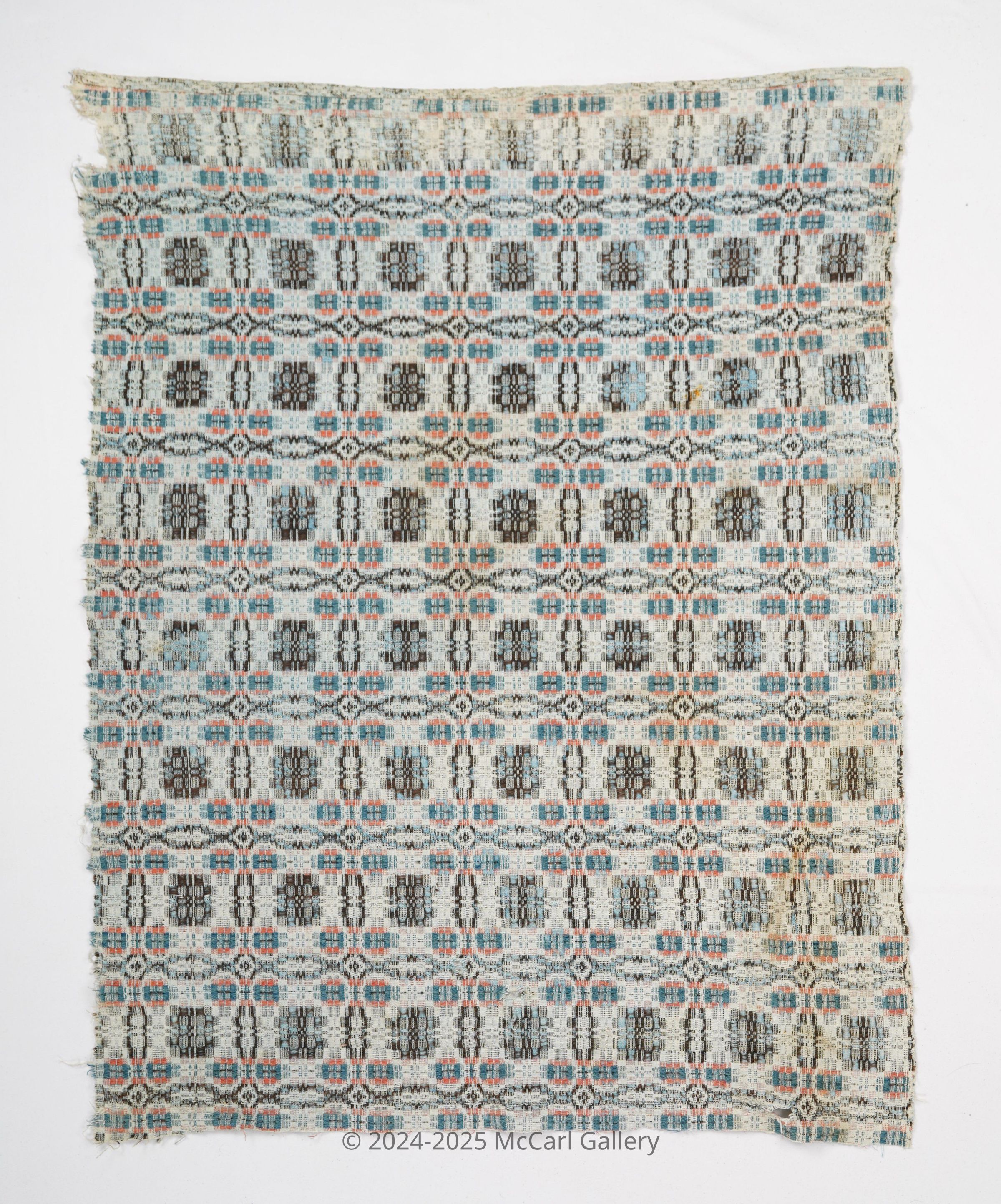 Blue, natural, red, and brown geometric overshot coverlet; fragment. No border or fringe.