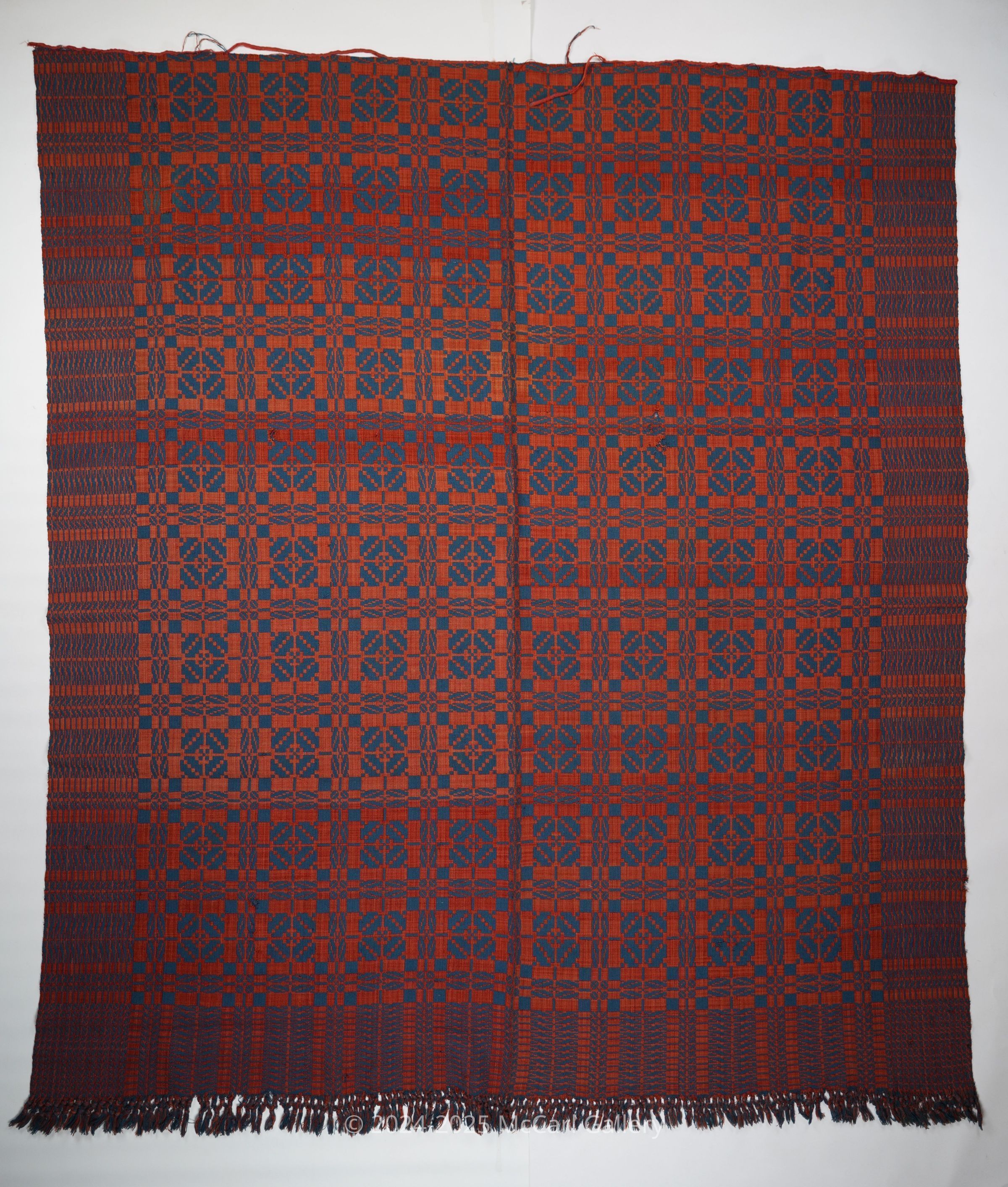 Red and navy geometric double weave coverlet with border on three sides and knotted self-fringe along bottom. Two joined panels.Collection