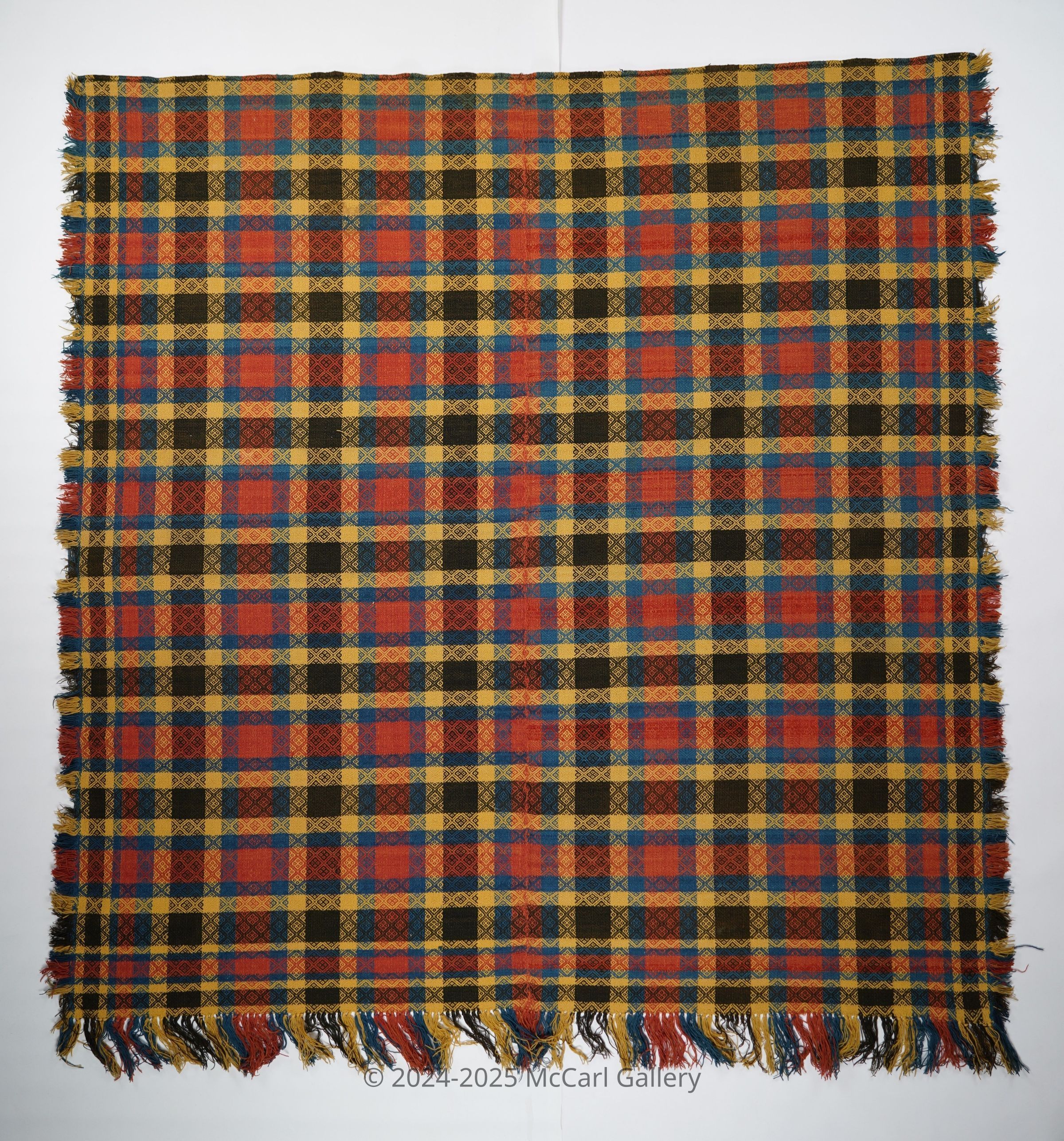 Red, blue, yellow, and black geometric twill coverlet with border and self-fringe on three sides. Two joined panels.Collection