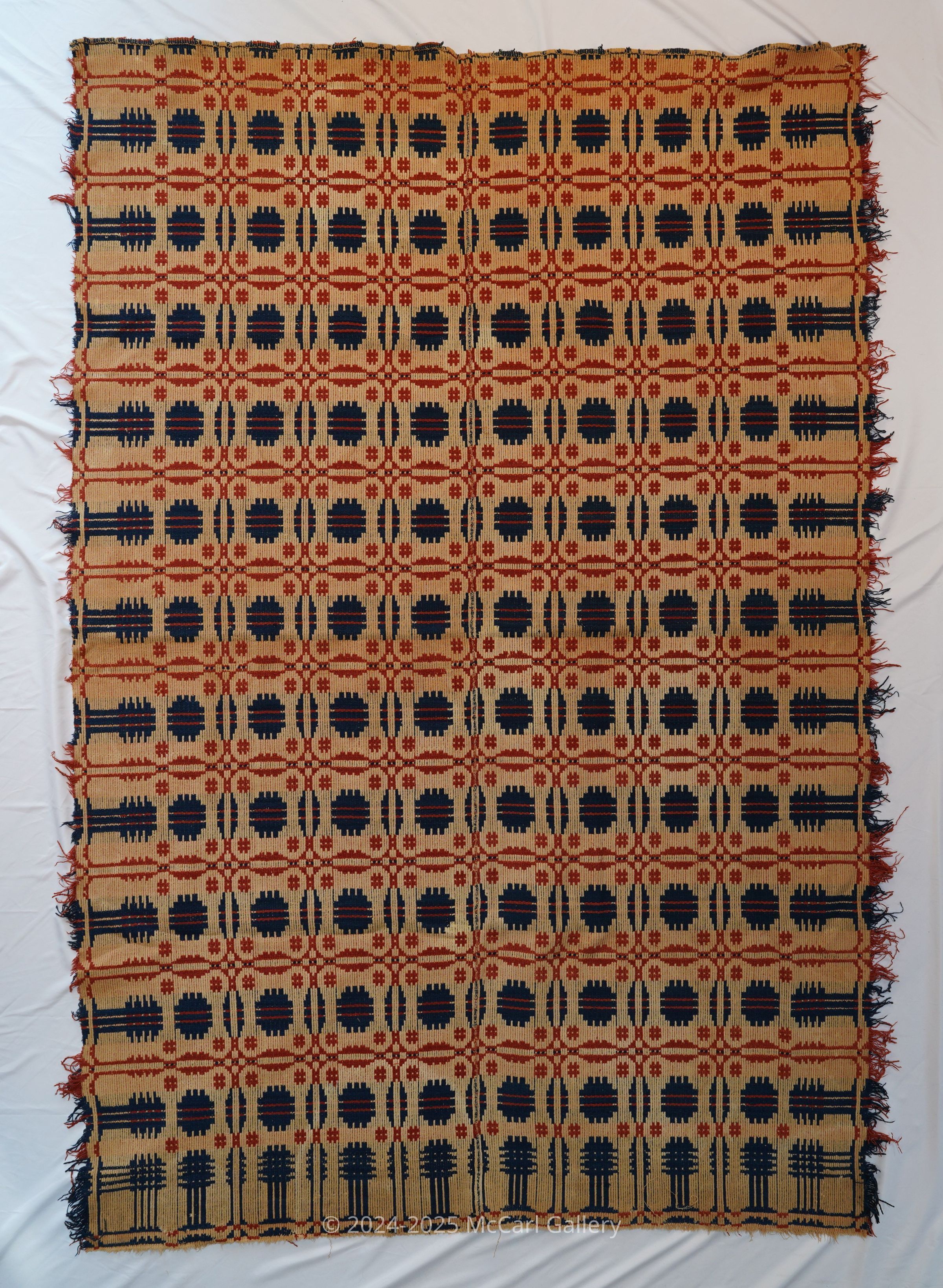Natural, navy, and red geometric tied beiderwand coverlet; two panels joined by a center seam. Border and fringe on three sides.