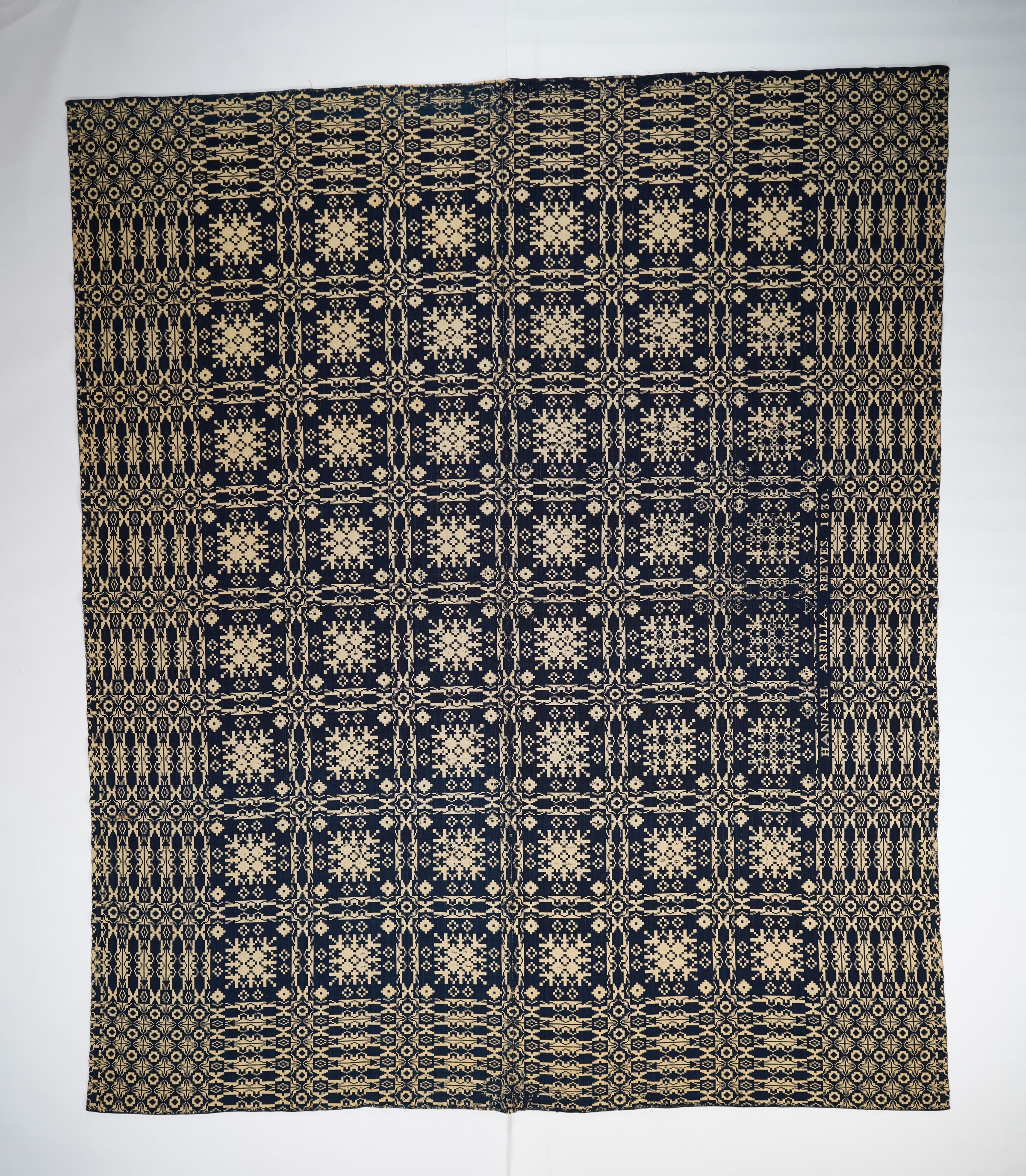Navy and natural geometric doublecloth coverlet with border on four sides. Two joined panels. Woven for Hannah Arrilla Reeves in Palmyra, Wayne Co., New York in 1830.Collection