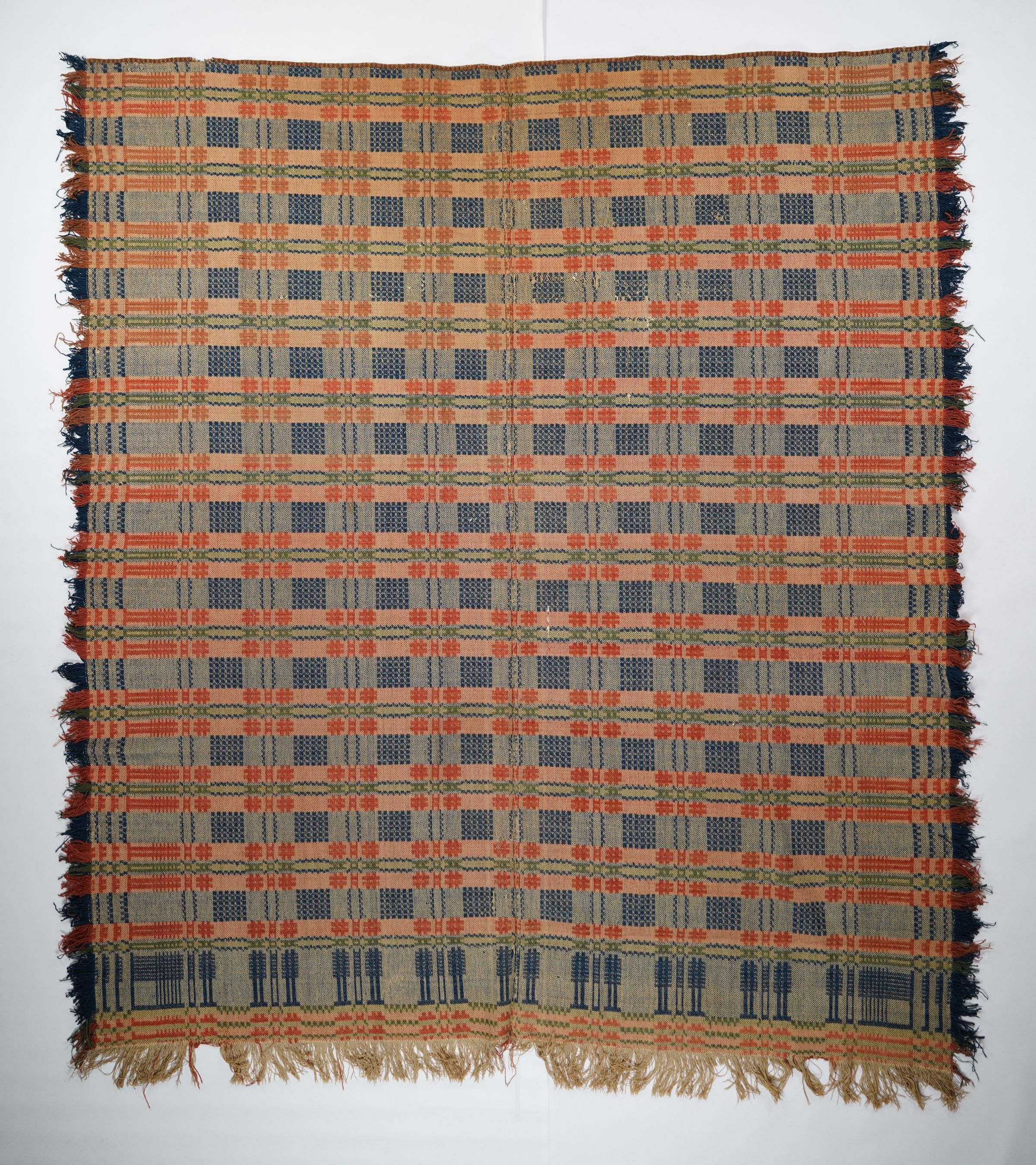 Red, navy, green, and natural geometric block twill coverlet with border and self-fringe on three sides. Two joined panels.Collection