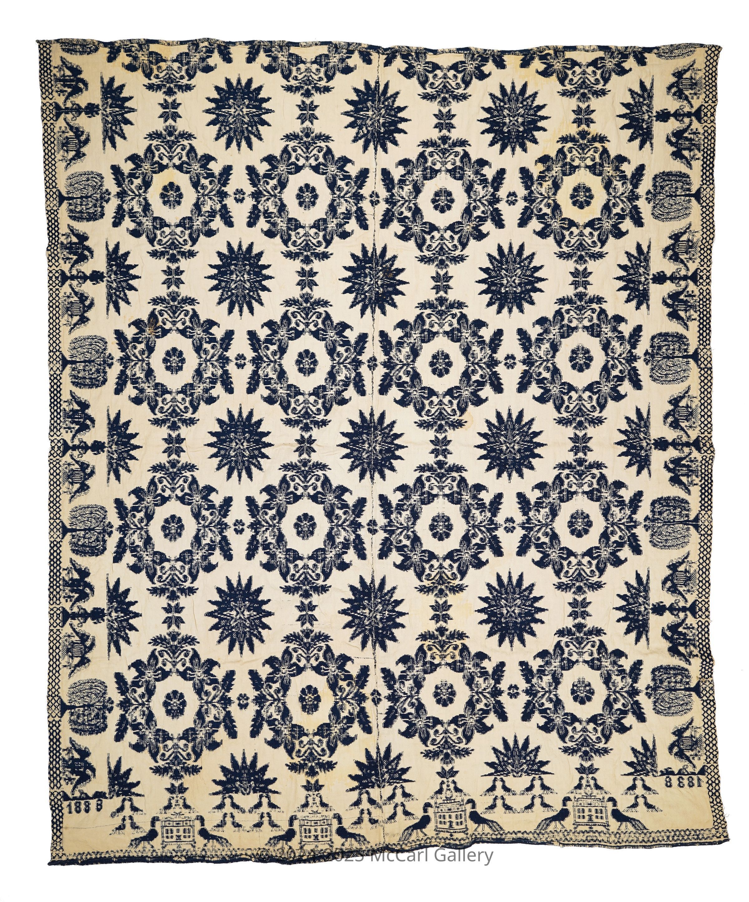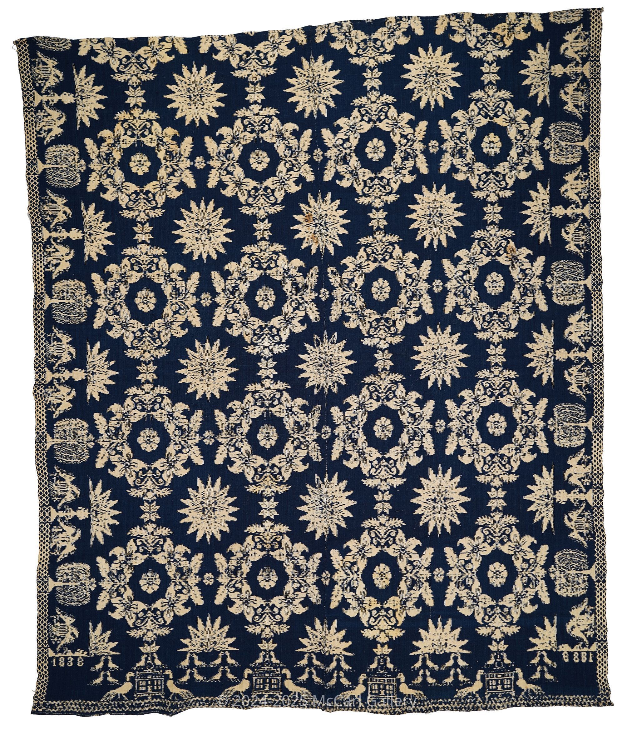 Navy and natural figured doubleweave coverlet; two panels joined by a center seam. No fringe. Shielded eagle and willow border on sides; birds and houses on bottom. Centerfield pattern is Lilies of France with starburst. Something went wrong in the setup of the warp to jumble the motifs at the edges where the dark and light colors meet.Collection