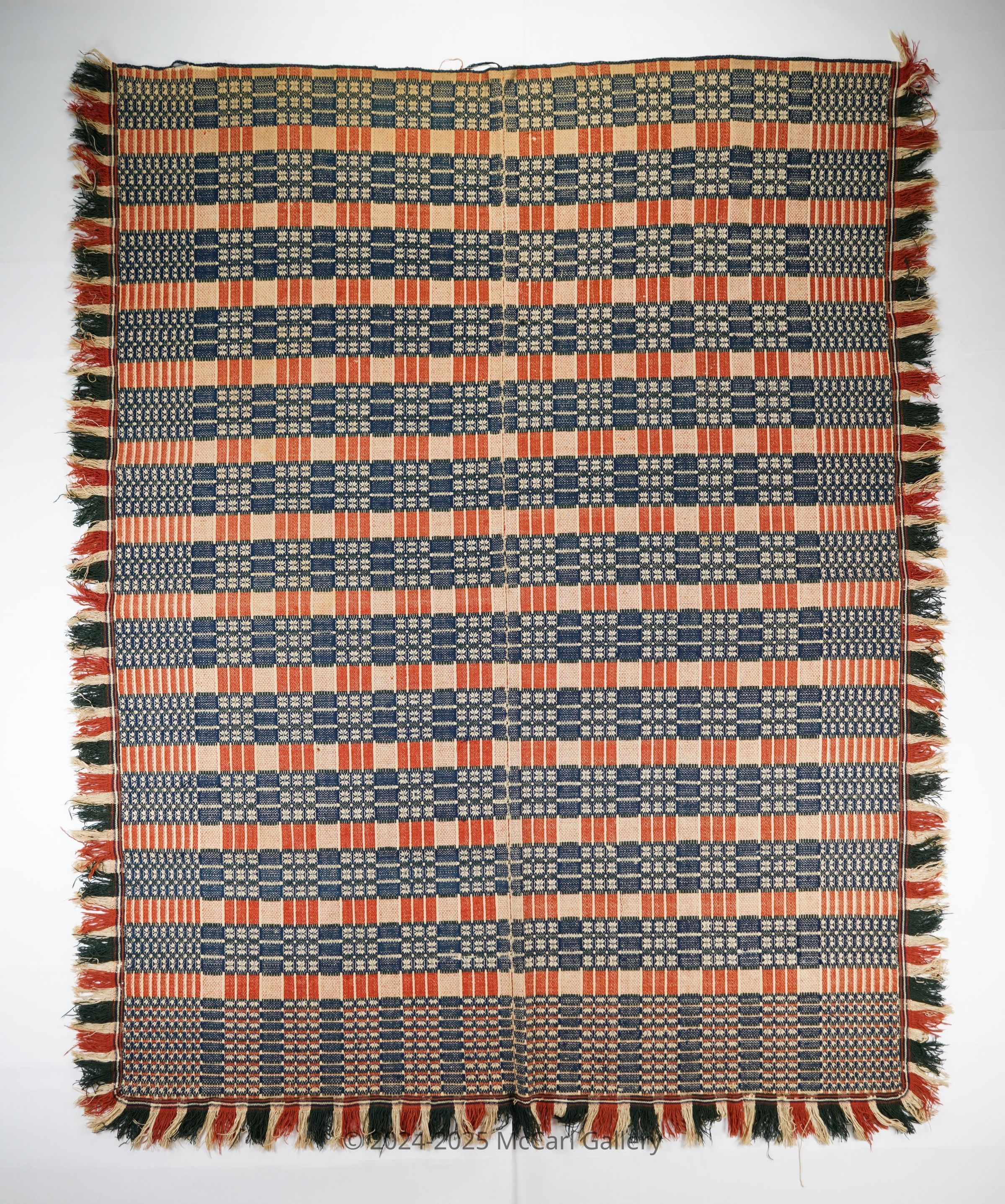 Navy, red, and natural geometric star point twill coverlet. Embroidered SGM.Collection