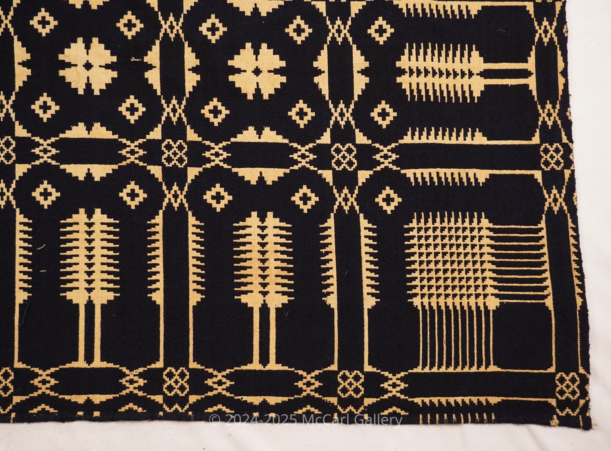 Natural and navy geometric double weave coverlet; two panels joined by a center seam. No fringe; border on three sides.
