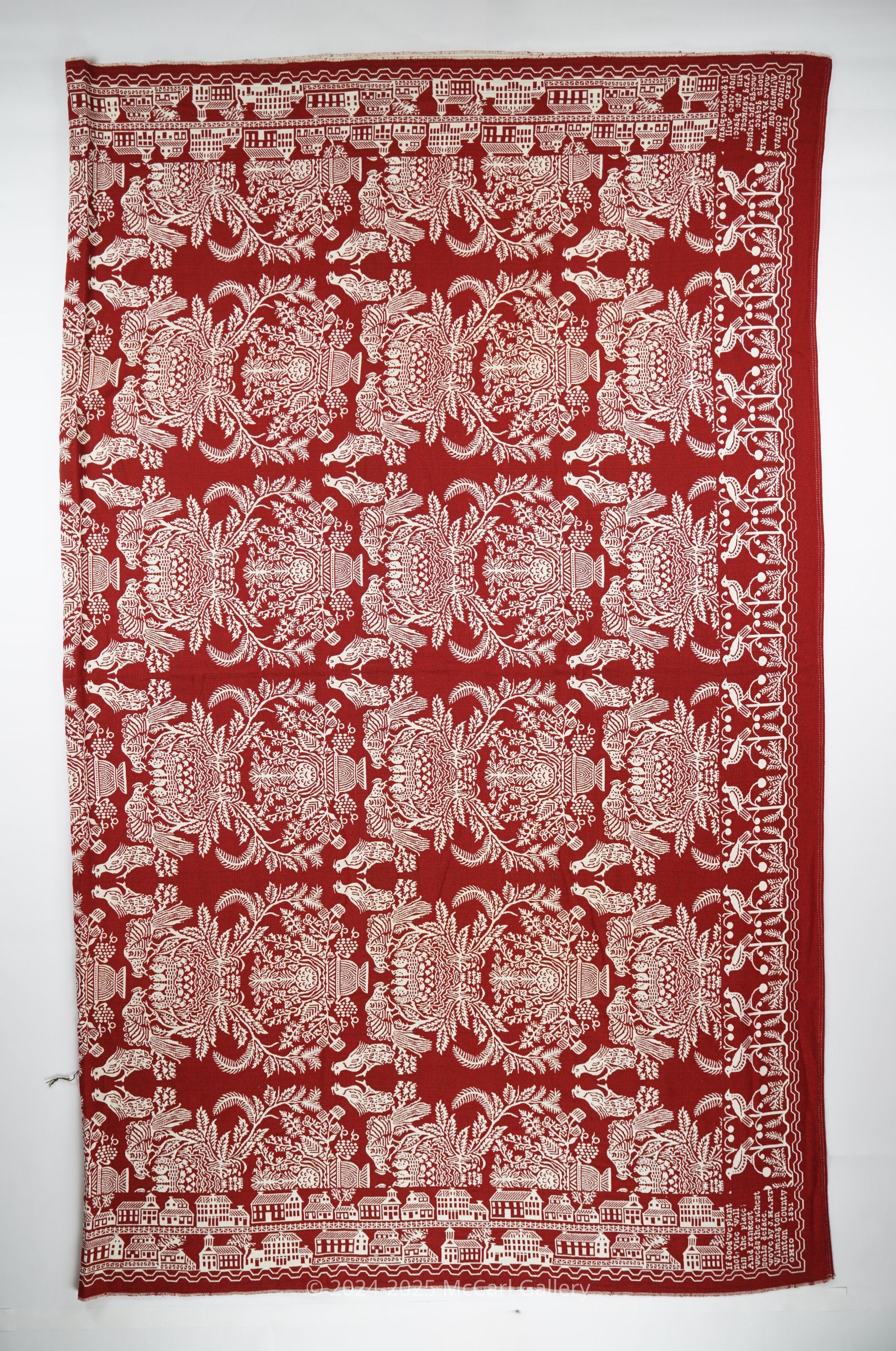 Reproduction red and natural figured doubleweave coverlet with border on three sides. Seamless. Reproduces a coverlet pattern wove by Jesse Hart in 1851 in Wilmington, Union Twp., Clinton Co., Ohio. Inscribed is "If good we plant not, vice will fill the place and rankest weeds the richest soils deface," based on a quote of Plutarch: "The richest soil, if uncultivated, produces the rankest weeds."Collection