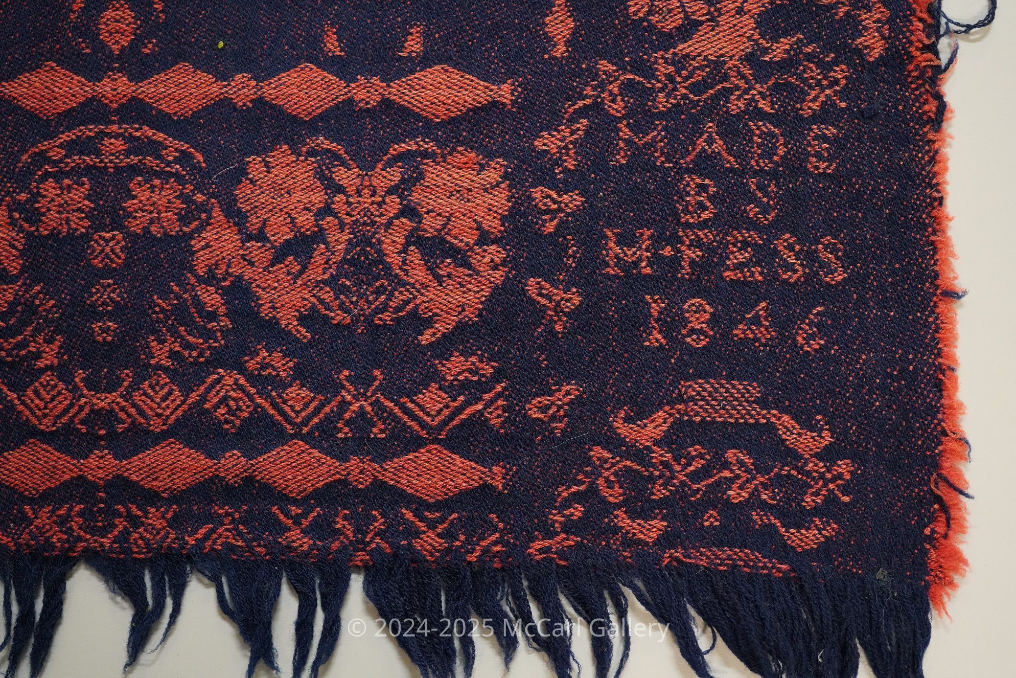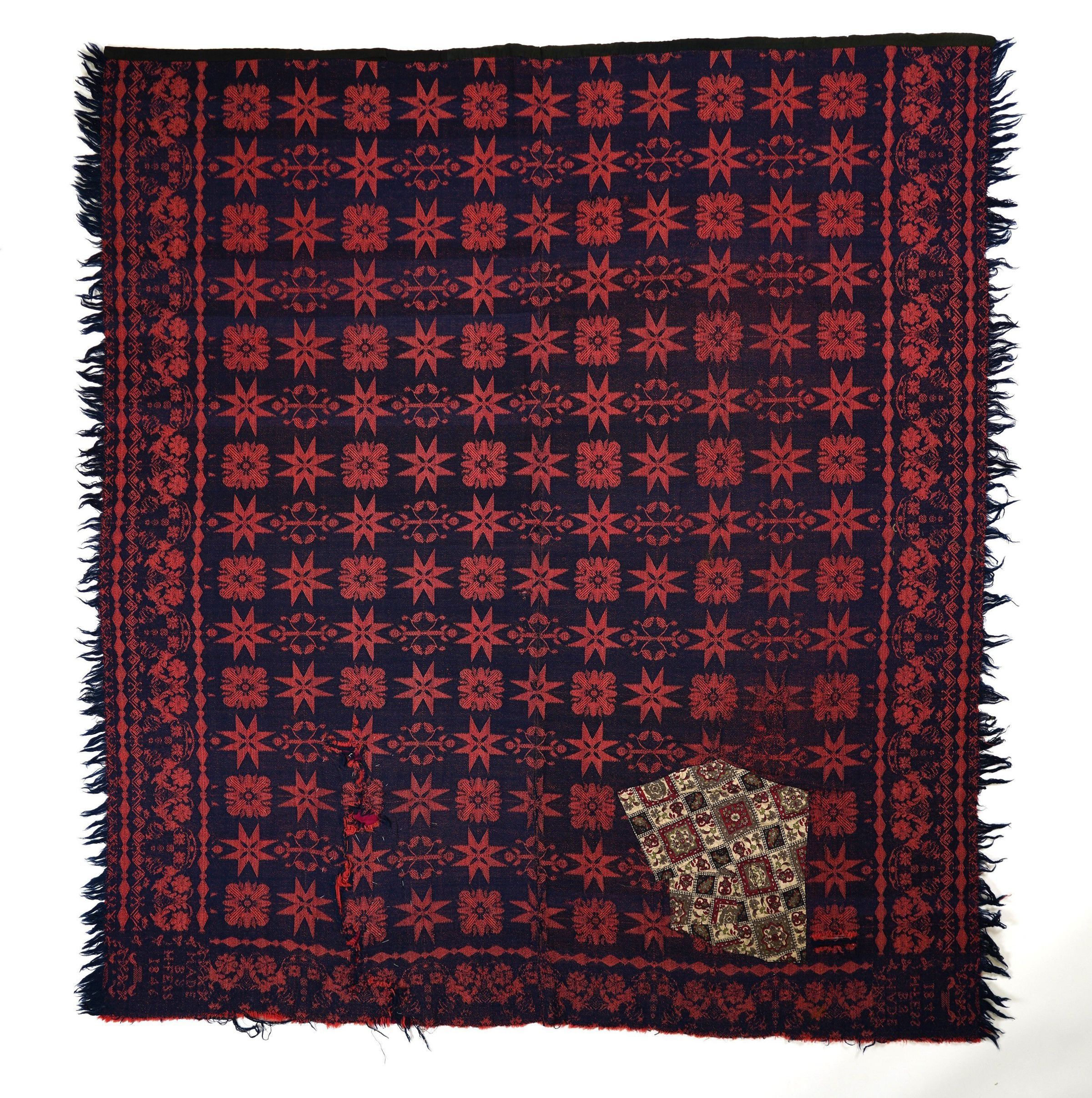Figured twill coverlet; red and navy wool. Two panels joined by a center seam (non-reversible). Floral border and fringe on three sides. Top edge finished with black fabric tape. Mended with multiple printed cotton patches; fraying bottom hem.