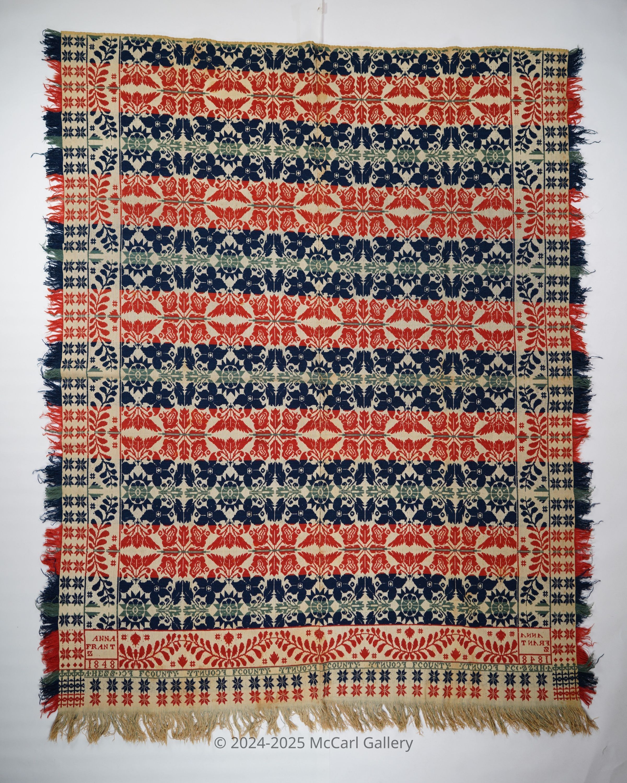 Red, green, navy, blue, and natural figured tied half doublecloth coverlet with border and self-fringe on three sides. Two joined panels. Woven for Anna Frantz by A. Hess in Franklin County in 1848.Collection