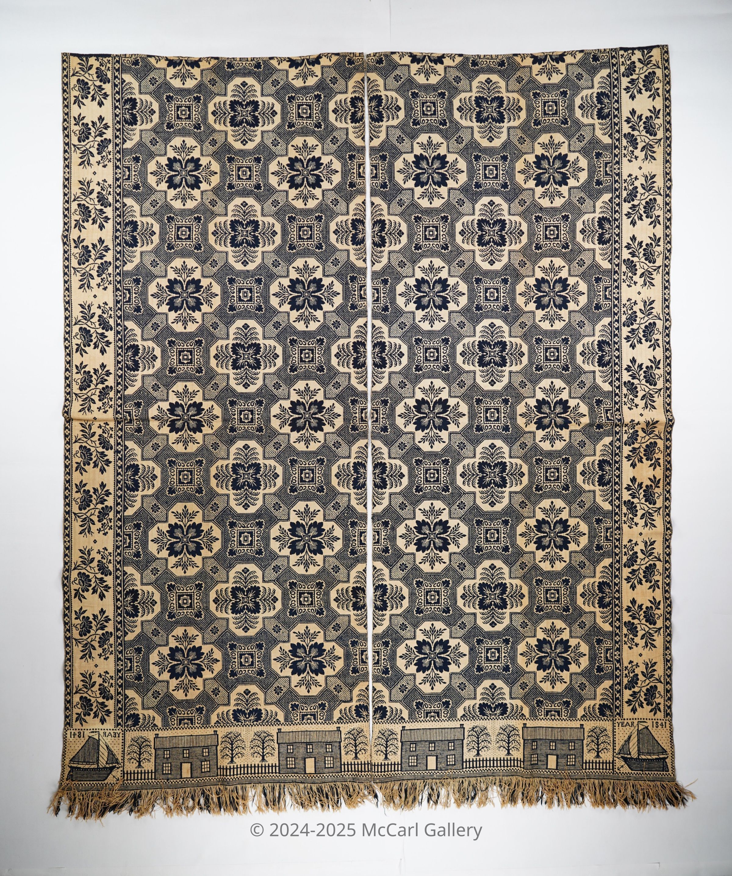 Figured and fancy doubleweave coverlet with borders on 3 sides and self-fringe on bottom. Two separate panels. Navy wool with undyed cotton. Floral centerfield pattern; floral border on sides; log cabin border on bottom. Woven by the Gilmour Family in 1841 with sailboat trademark in cornerblock.Collection
